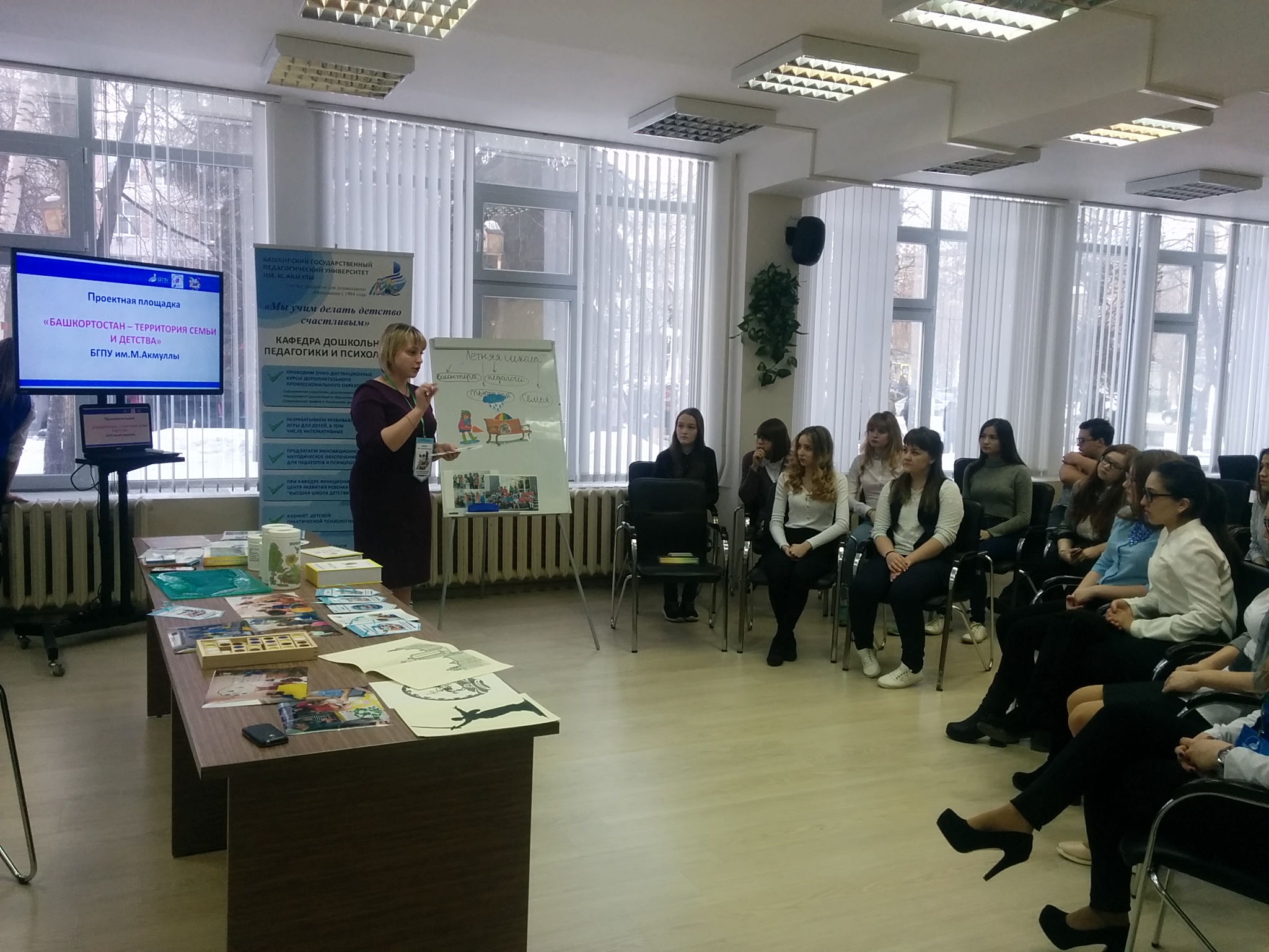 Студентка 3 курса профиля "Дошкольное образование" Яна Чулкова под руководством зав. кафедрой Борониловой И.Г. презентовала проект «Ясли - молодой студенческой семье» в день Российского студенчества - 25 января 2018 г. Она познакомила студентов 1 курса Института педагогики и гостей вуза с проектом. Цель проекта – разработка и внедрение моделей присмотра и ухода за детьми раннего возраста (до 3-х лет) в различные организации. Данный проект уже реализован на базе ЦРК "Центр развития ребенка КотоффKids" в БГПУ. Проект и методические рекомендации, разработанные студентами и преподавателями кафедры дошкольной педагогики и психологии вызвал интерес главы Республики Башкортостан Р.З. Хамитова, прошло обсуждение реализации проекта и его  распространения. Студенты 1 курса в процессе тренинга познакомились с методикой разработки, изготовления и проведения дидактических игр для детей дошкольного возраста.