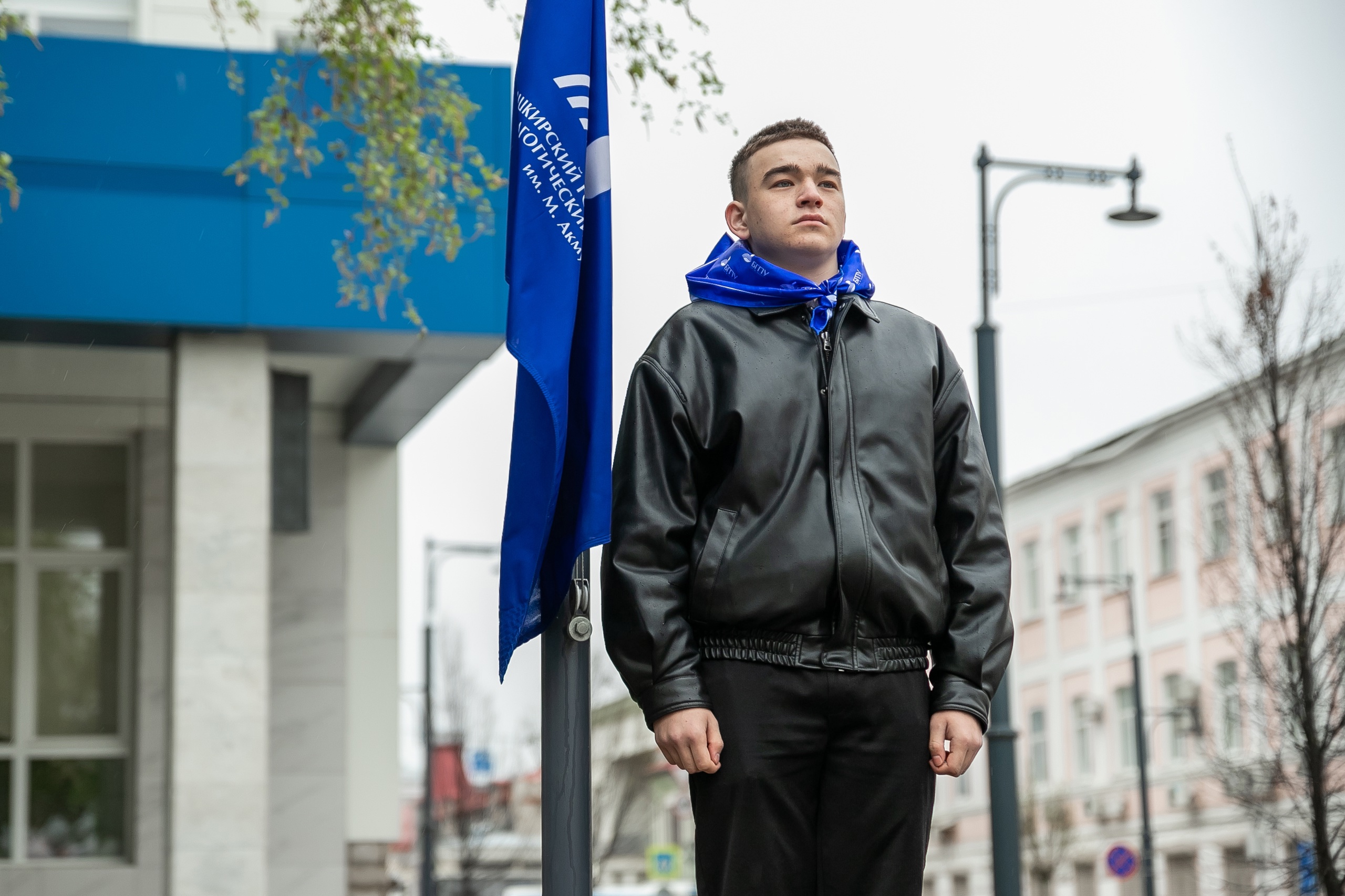 Почетное право поднять флаги на площади перед вузом было предоставлено студентам колледжа БГПУ им. М. Акмуллы, активным участникам игр КВН в Республике Башкортостан: