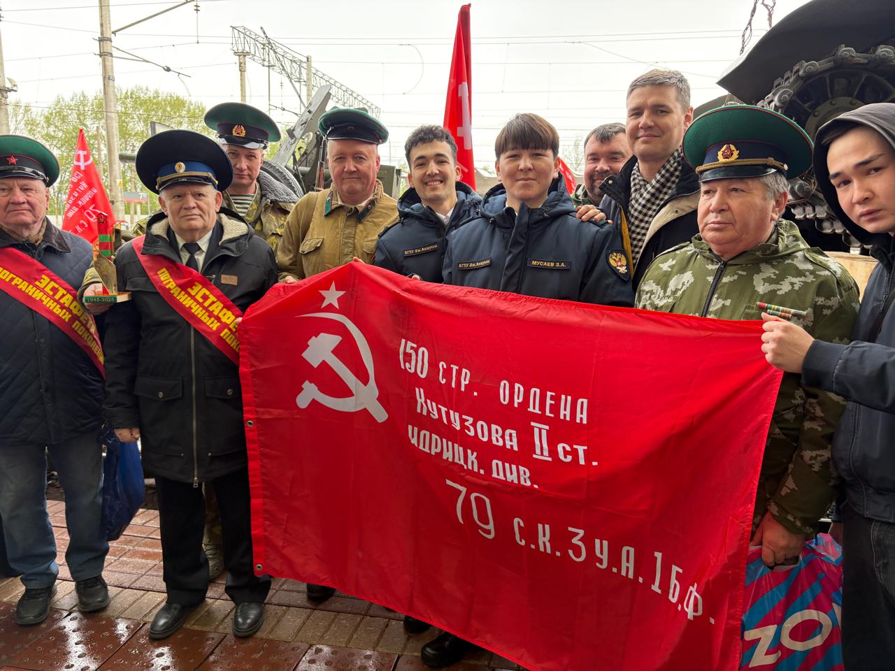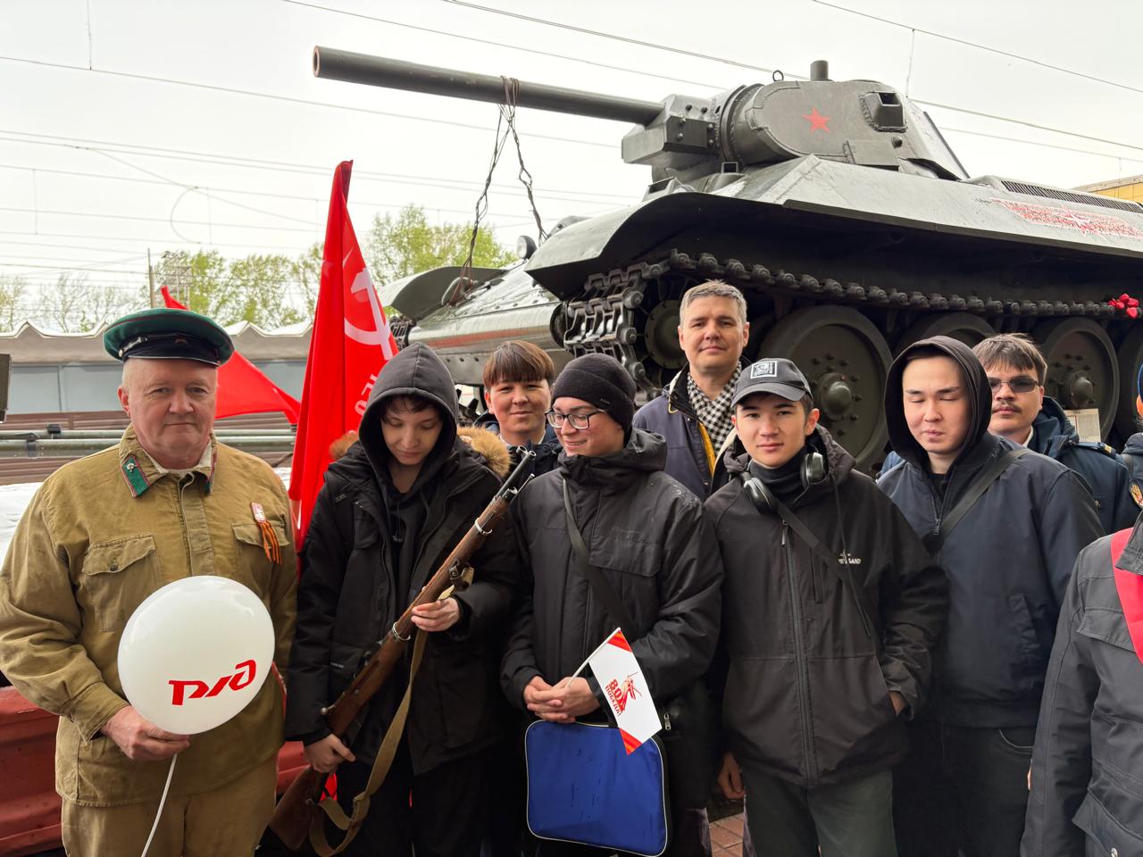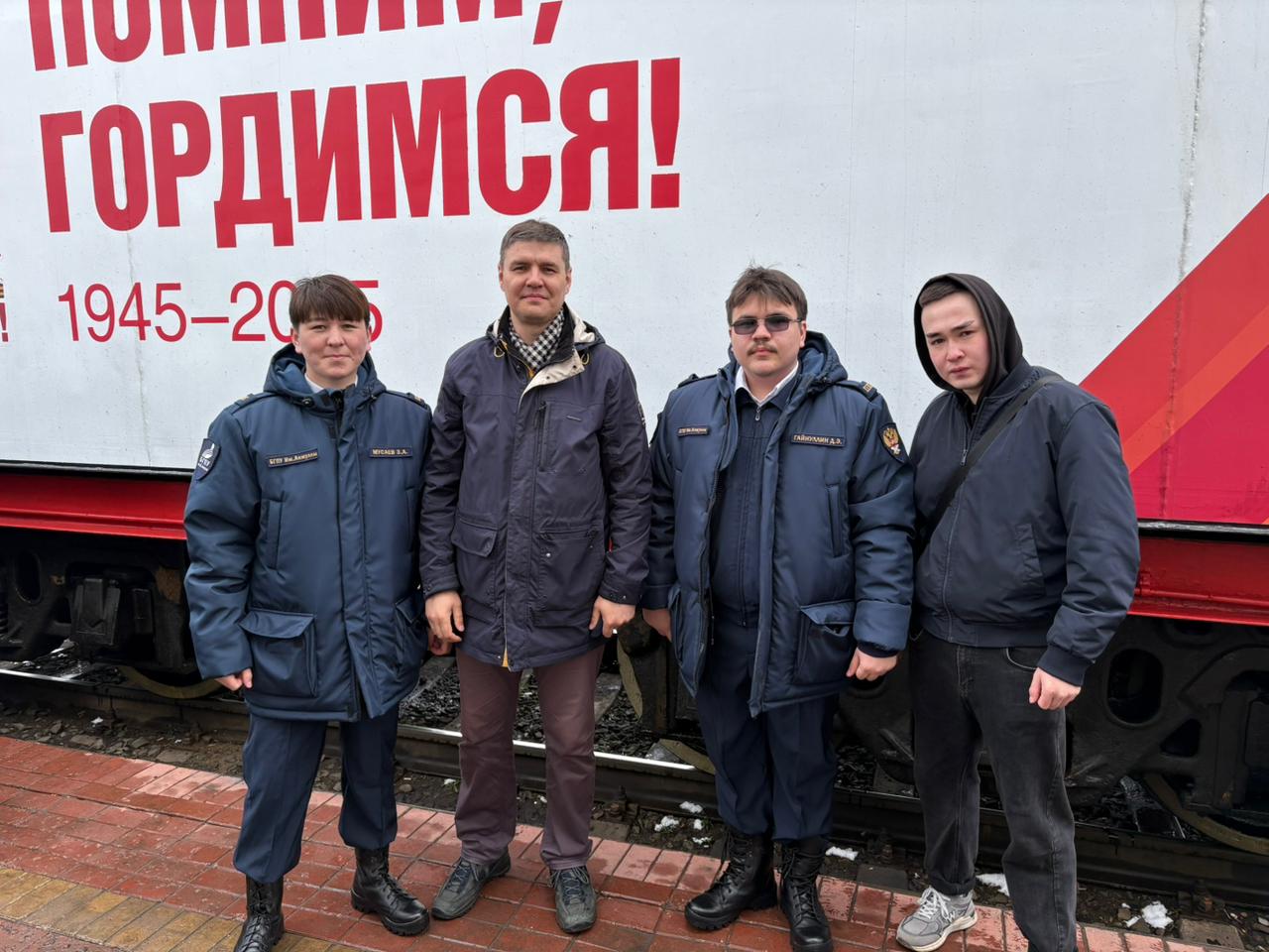 Студенты Акмуллинского университета, члены центра военно-спортивной подготовки и патриотического воспитания «Яугир-воин»" 29 апреля 2025 г. на платформе железнодорожного вокзала Уфы приняли участие в торжественной встрече «Паровоза Победы» Куйбышевской железной дороги.