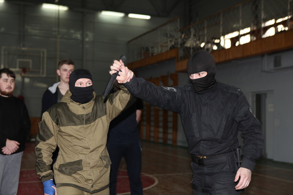 Следующим пунктом программы стало посещениями 26 января студентами-юношами отряда специального назначения "Гром" Управления по контролю за оборотом наркотиков МВД РБ. Шесть ребят увидели работу полицейских изнутри и лично ознакомились с буднями оперативников. Все парни специально переоделись в спортивную форму, чтобы почувствовать себя настоящими бойцами отряда «Гром». Ребятам показали приемы самообороны и как вести себя при нападении преступников, продемонстрировали арсенал вооружения и снаряжение спецназа.Одним из самых запоминающихся моментов мероприятия стал мастер-класс по разборке и сборке автомата Калашникова и пистолета Макарова.В завершении встречи участникам акции удалось выехать на место происшествия. Студенты смогли на деле увидеть, как работают сотрудники спецназа.