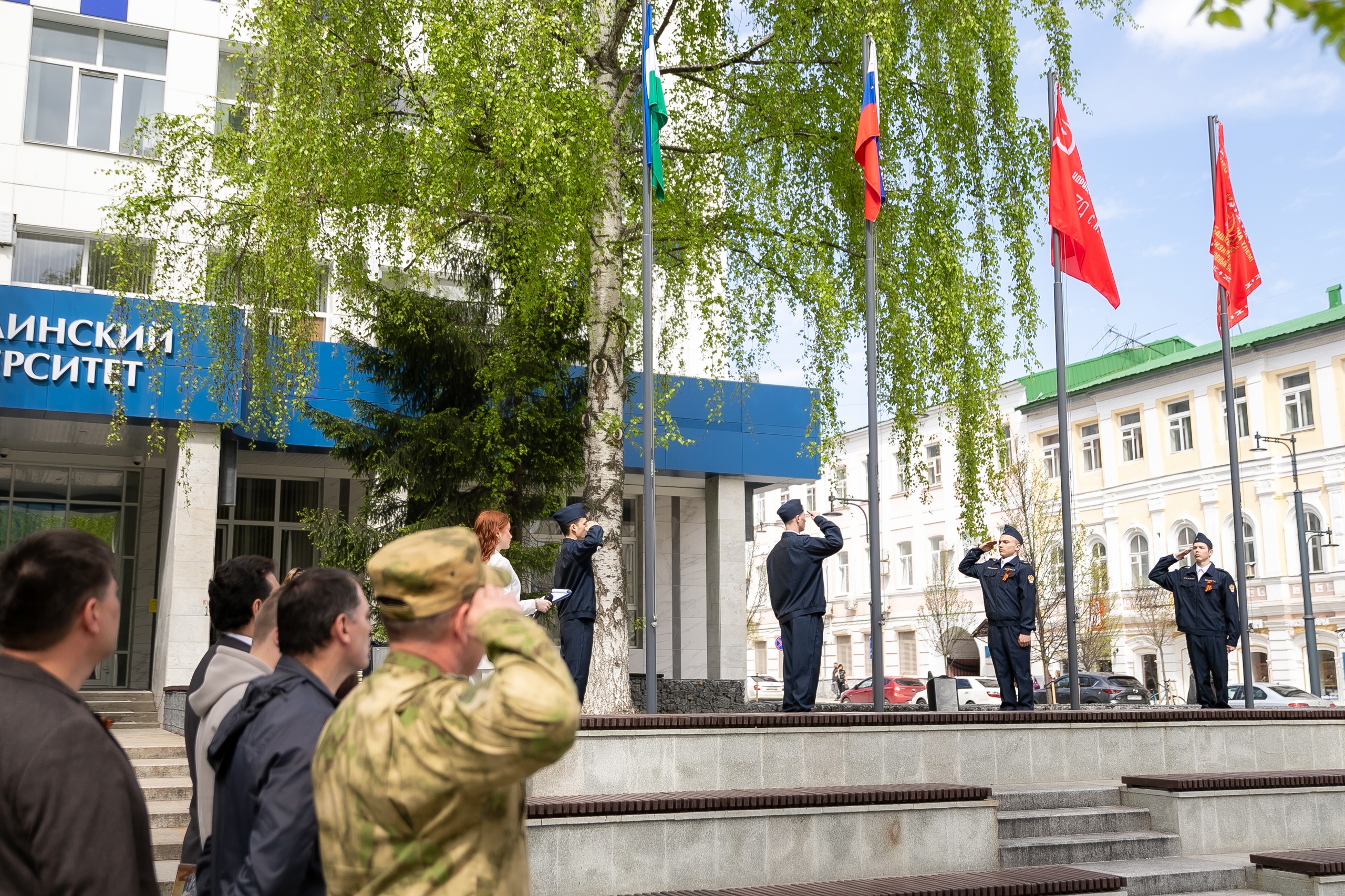 Накануне празднования 80-летия Великой Победы перед Акмуллинским университетом подняли флаги и знамёна