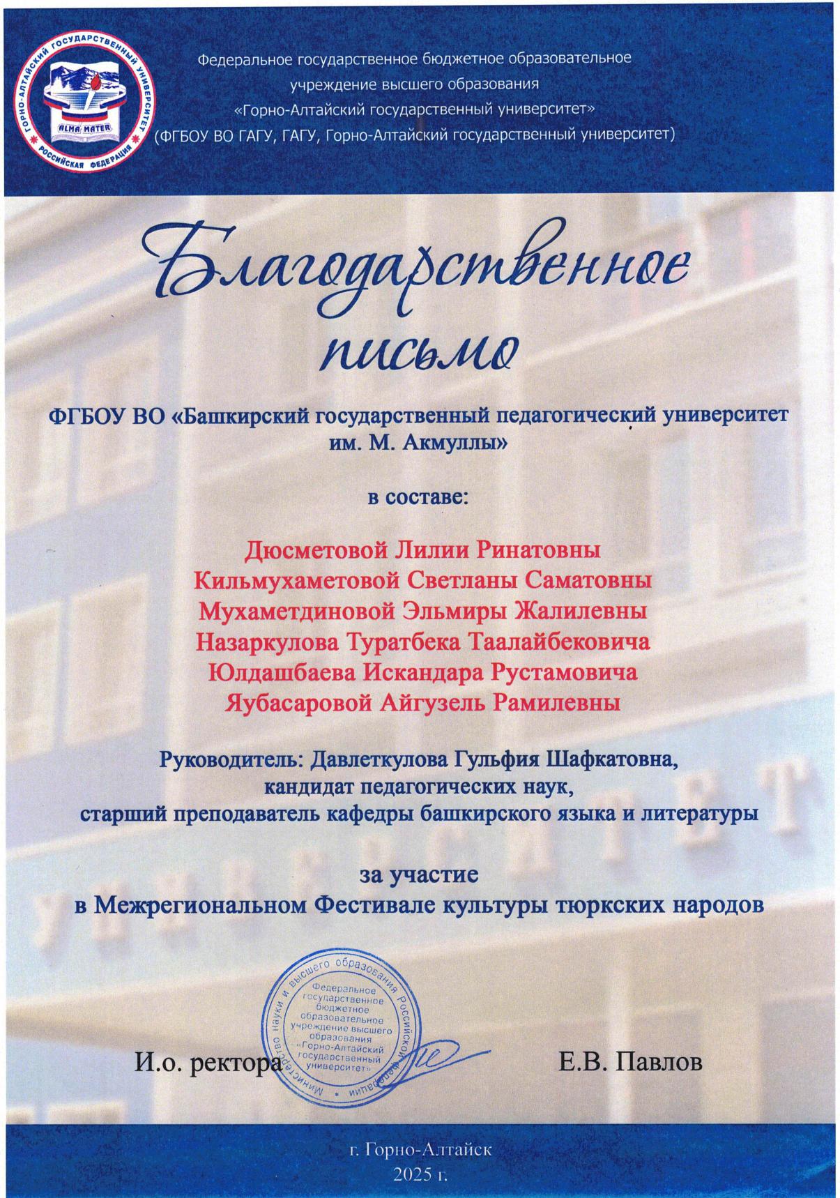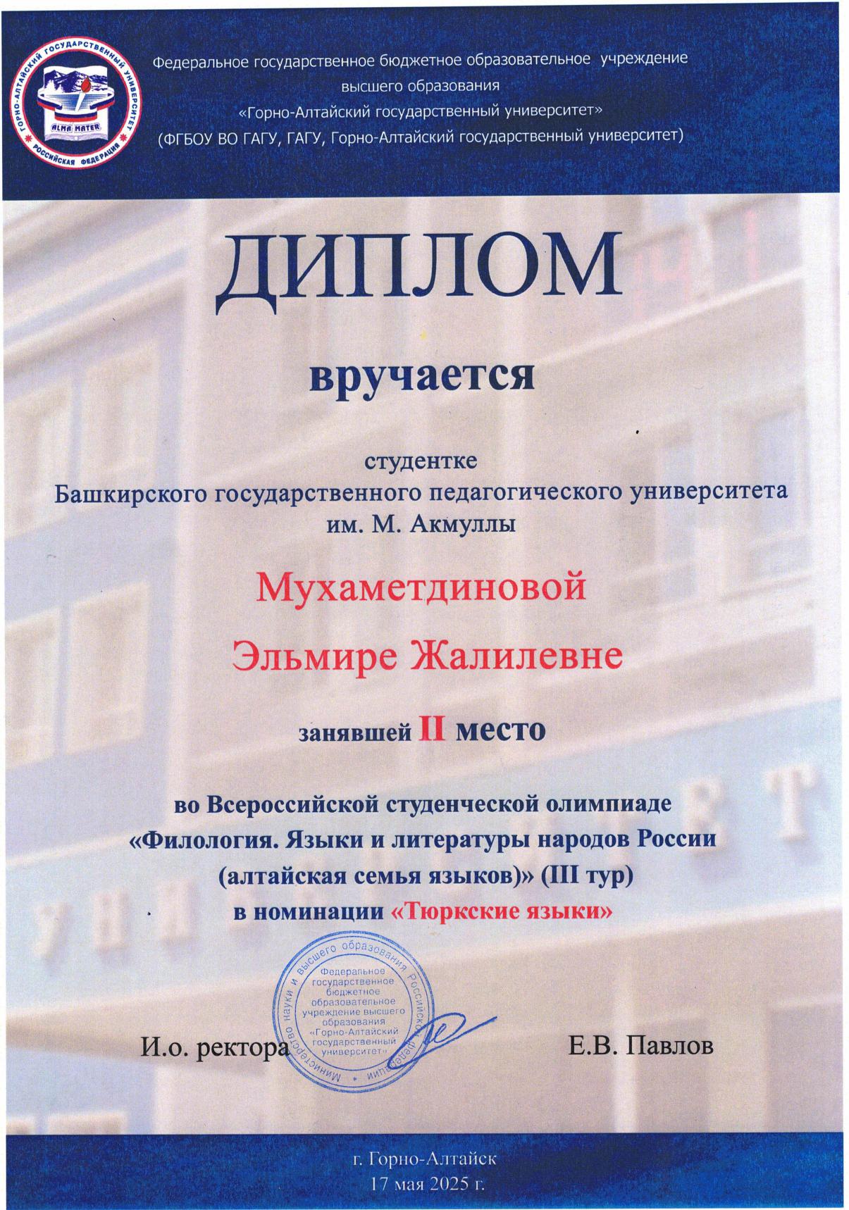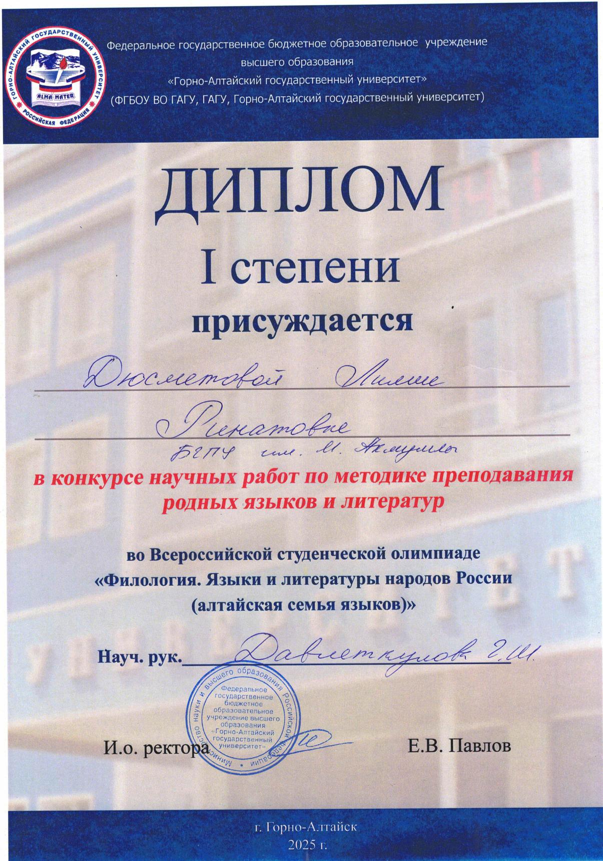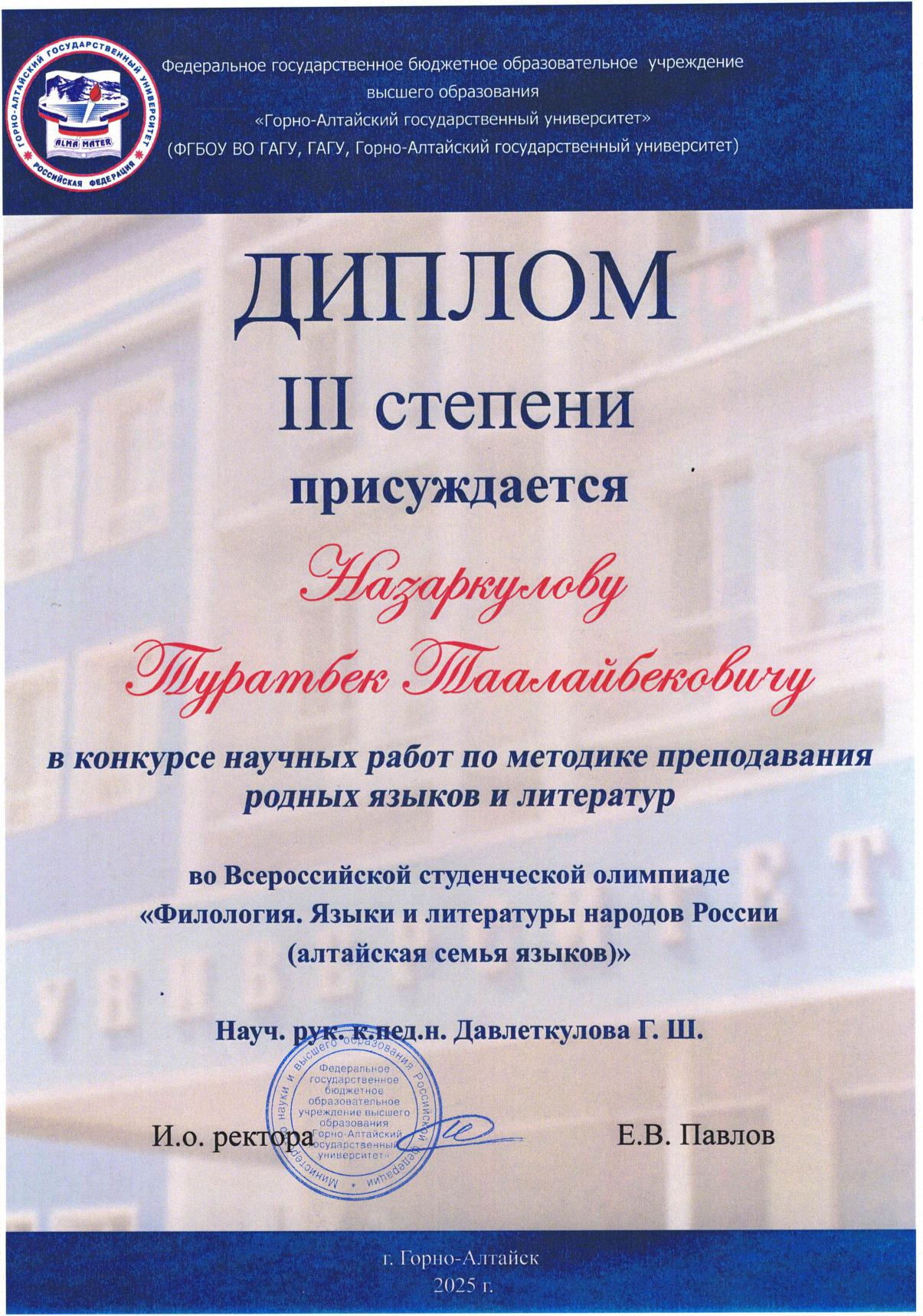 С 11 по 18 мая 2025 года в Республике Алтай на базе Горно-Алтайского государственного университета прошла Всероссийская студенческая олимпиада «Филология. Языки и литературы народов Российской Федерации (тюркская группа)». Участниками олимпиады стали команды из Башкортостана, Якутии, Хакасии, Тувы и Алтая.