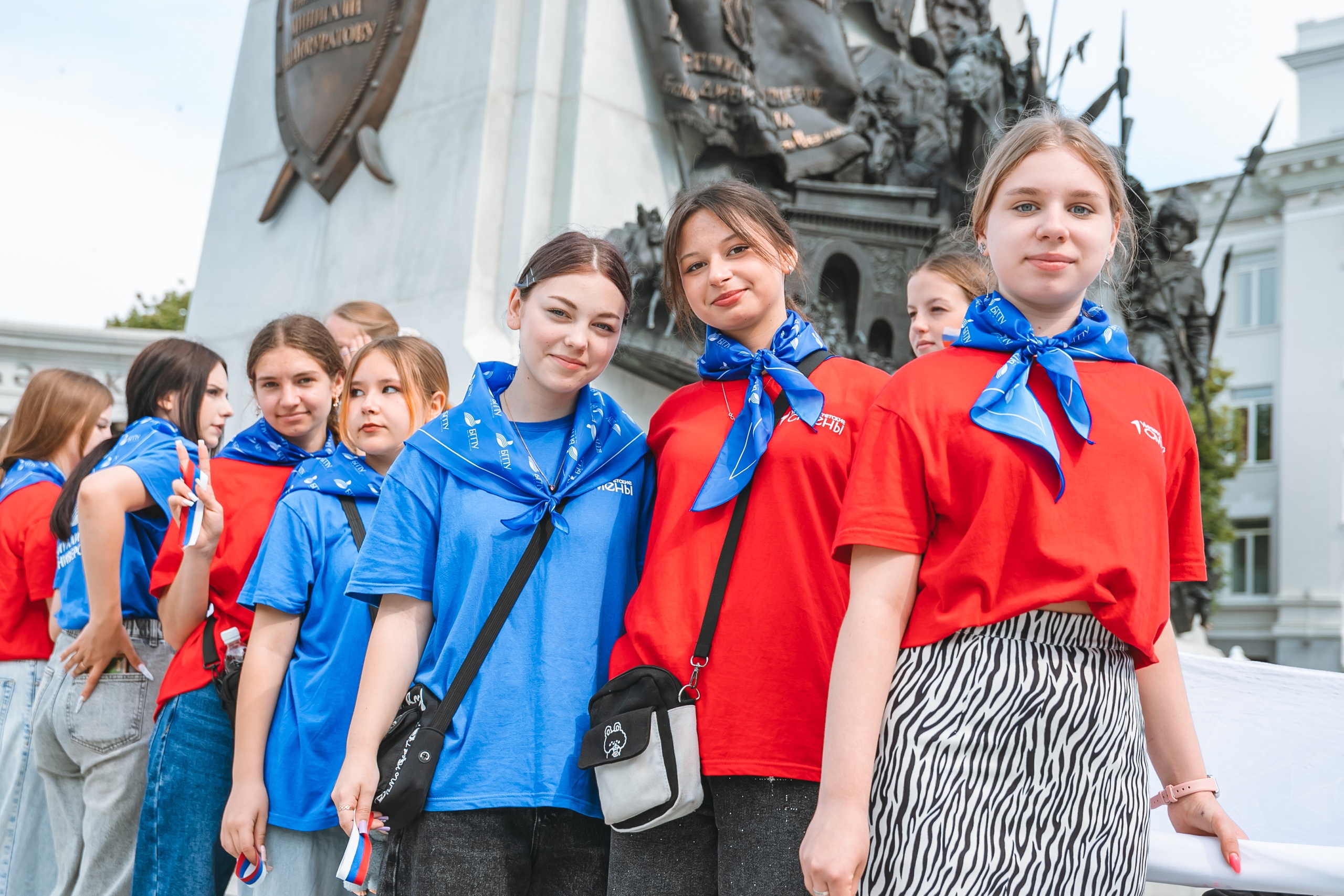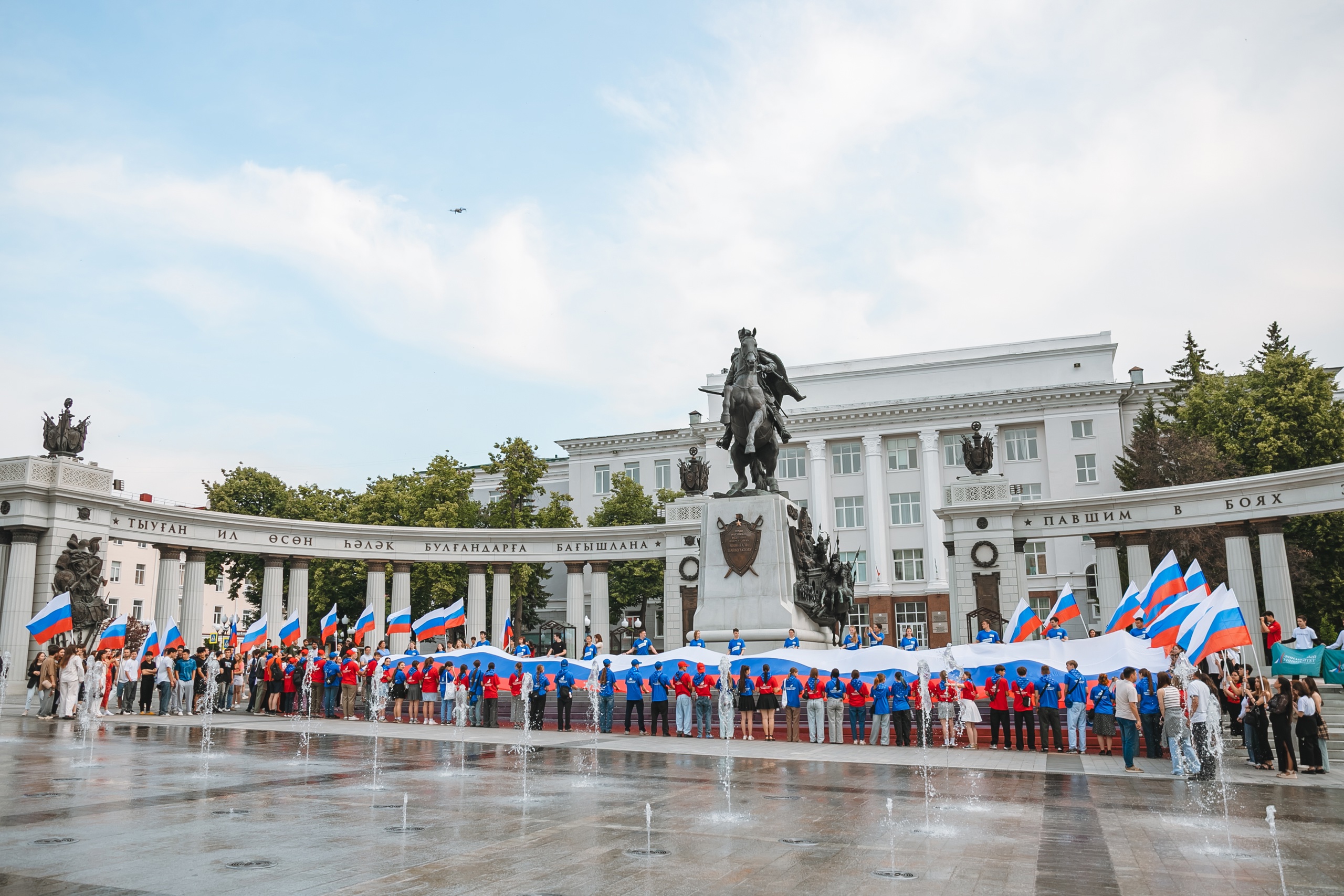 После школьники из ДНР приняли участие во Всероссийской акции «Флаг России» на Советской площади, где вместе с активистами Уфы развернули триколор Российского флага.