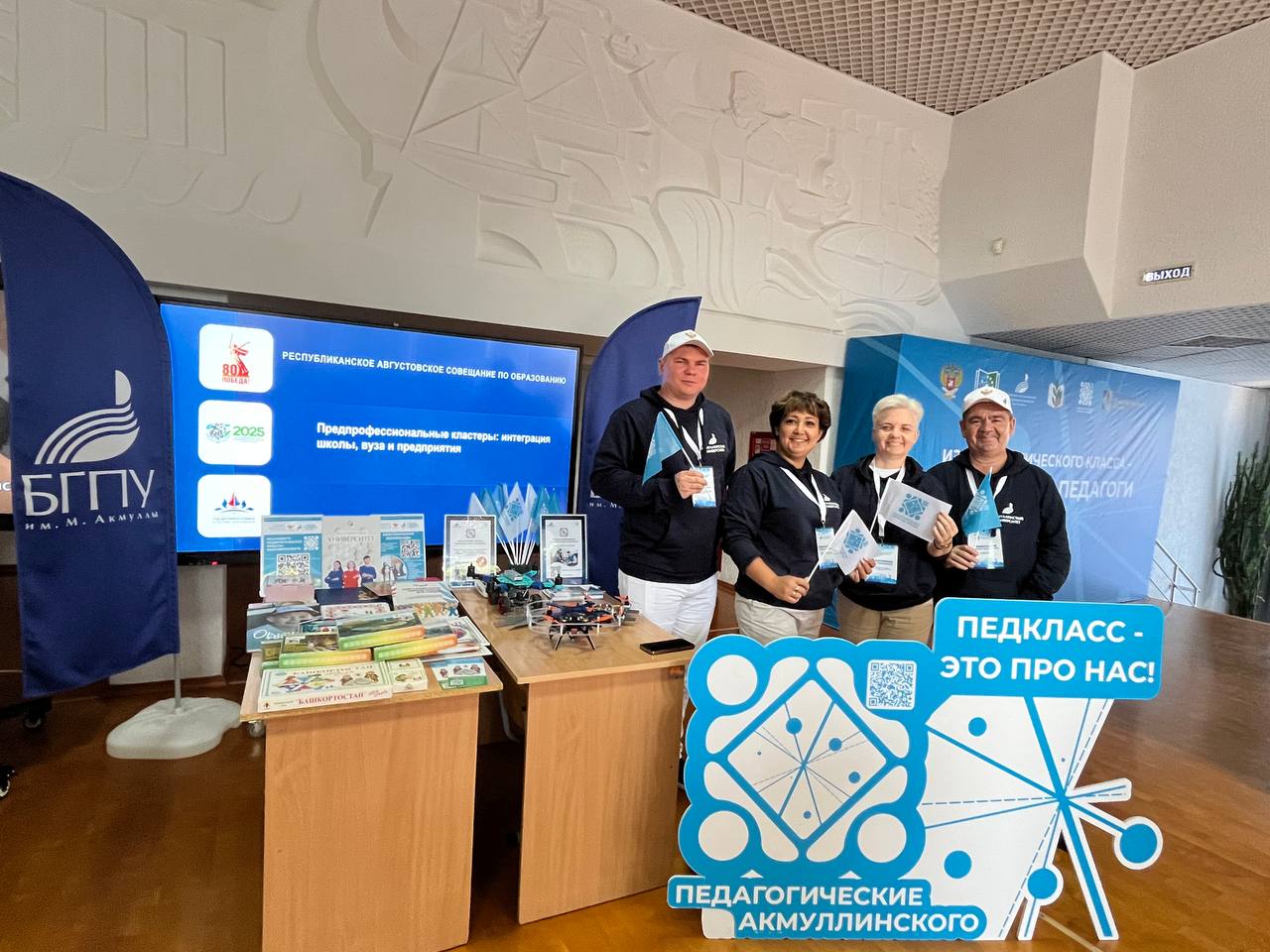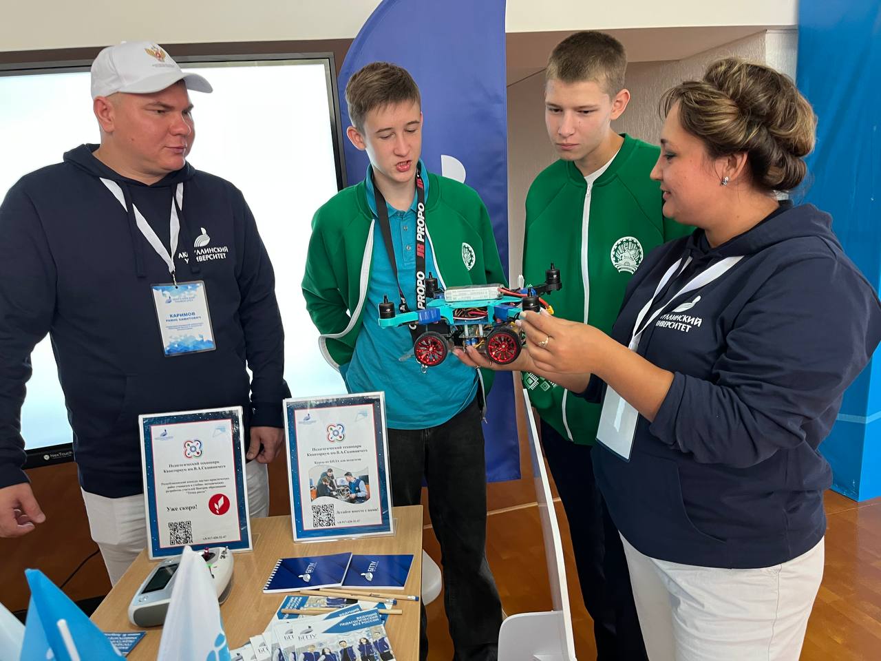 На выставке в рамках республиканского совещания был представлен опыт работы Акмуллинского университета с психолого-педагогическими классами школ республики, в том числе по разработке и реализации проектов с использованием интерактивных игровых технологий: «Орлята России», «Семейный очаг», «Акмуллинские каникулы», «Развивающие игры-лото «Портрет Башкортостана», «Юрта знаний». Представители педагогического Кванториума имени В.А. Садовничего презентовали образовательные программы для педагогов «Точек роста» и детских технопарков по робототехнике и БПЛА, а также образовательные мероприятия, проводимые в Кванториуме в рамках предпрофильной интеграции школы и вуза, и совместные проекты с учащимися школ. С этими направлениями работы вуза гостей стенда знакомили руководитель Центра профориентации Фиданис Тимерханов, замдиректора Акмуллинского технопарка Эльвира Шаймухаметова, и.о. заведующего кафедрой профессионального и социального образования Нина Набиулина и доцент кафедры физики и нанотехнологий Рамис Каримов