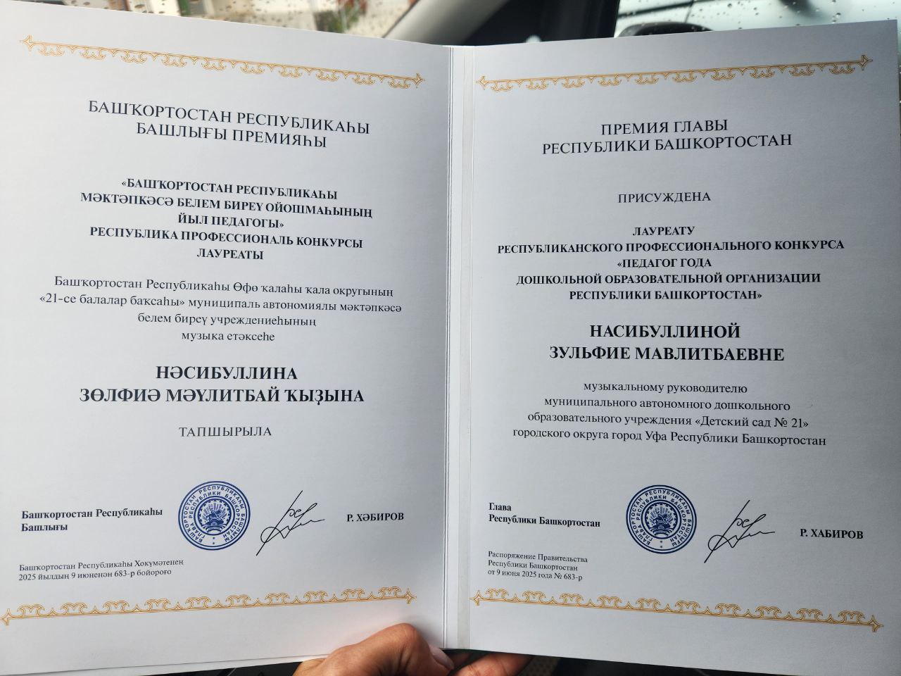 Торжественная церемония награждения состоялась 25 августа на республиканском августовском совещании по образованию, которое прошло в Бирске. Награды вручила первый заместитель министра просвещения Башкортостана Светлана Антипина. Премия присуждается ежегодно  с 2023 года педагогам – победителям и лауреатам республиканского профессионального конкурса «Педагог года дошкольной образовательной организации Республики Башкортостан» и проводимого в его рамках конкурса «Педагог года дошкольной образовательной организации с обучением на родном языке».