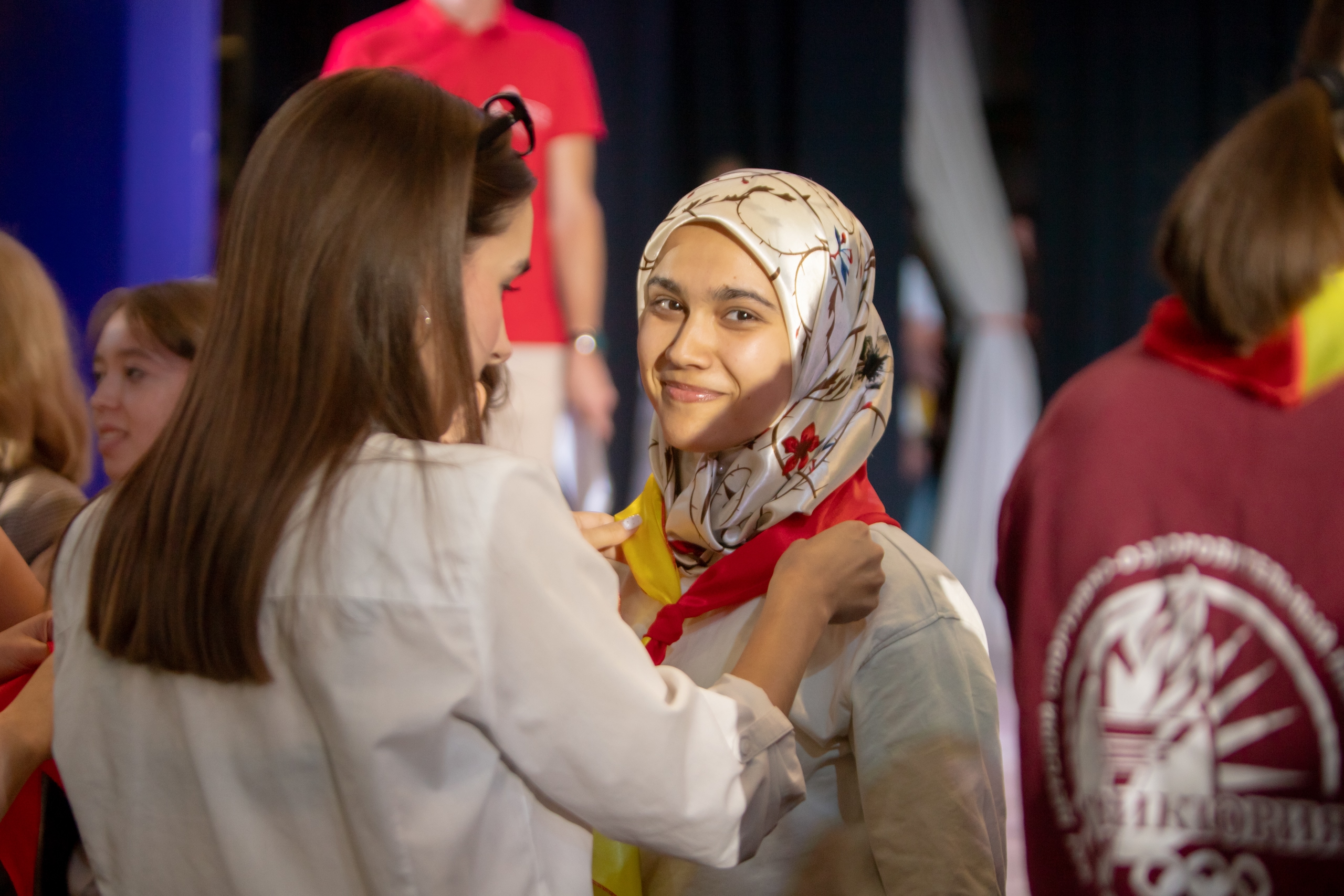 В торжественной обстановке командиры четвертого курса посвятили в вожатые командиров третьего курса и повязали им красно-желтые галстуки – символ Республиканского центра подготовки вожатых «Перспектива» имени Е. Поспеловой.