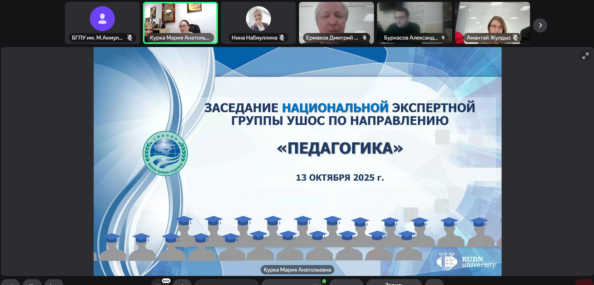 13 октября 2025 года в Российском университете дружбы народов им. П.Лумумбы состоялось очередное заседание экспертной группы УШОС по направлению подготовки «Педагогика». На собрании присутствовали представители вузов с российской стороны, участниками от БГПУ им. М.Акмуллы стали директор Института педагогики Ирина Боронилова, и.о. зав. кафедрой профессионального и социального образования Нина Набиуллина, начальник управления международных связей Резеда Мухитдинова.