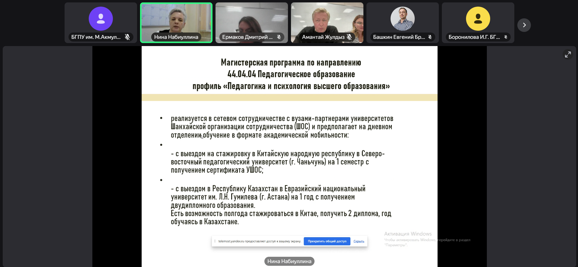И.о. зав. кафедрой профессионального и социального образования Нина Набиуллина рассказала о работе Акмуллинского университета по направлению «Педагогика» в 2024/2025 году, а также планах работы на 2025/2026 учебный год, поделилась накопленным опытом кафедры по работе в рамках совместных двудипломных программ с Евразийским национальным университетом им. Л.Н. Гумилева, Северо-восточным педагогическим университетом Китая.