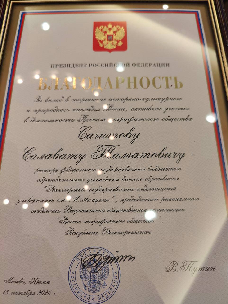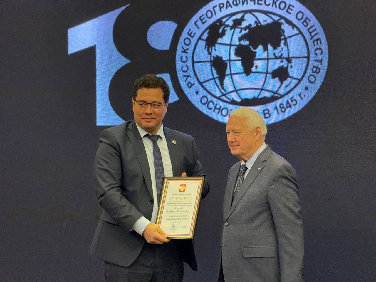Первый вице-президент, академик РАН и председатель Учёного совета РГО Николай Касимов вручил Салавату Сагитову Благодарность Президента Российской Федерации Владимира Путина.