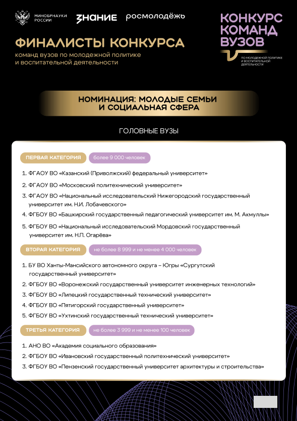 Конкурс команд вузов – это площадка для признания заслуг и поиска лучших практик в сфере молодежной политики и воспитательной деятельности. Эксперты оценивают результаты деятельности команд за период 2023-2025 годов по нескольким критериям: число привлеченных грантов, количество и качество проведенных мероприятий, эффективность внешних партнерств, развитие корпоративной культуры и реализация просветительских мероприятий. По результатам будут награждены самые эффективные команды, которые формируют образовательную среду и успешно реализуют воспитательную деятельность в своих университетах.