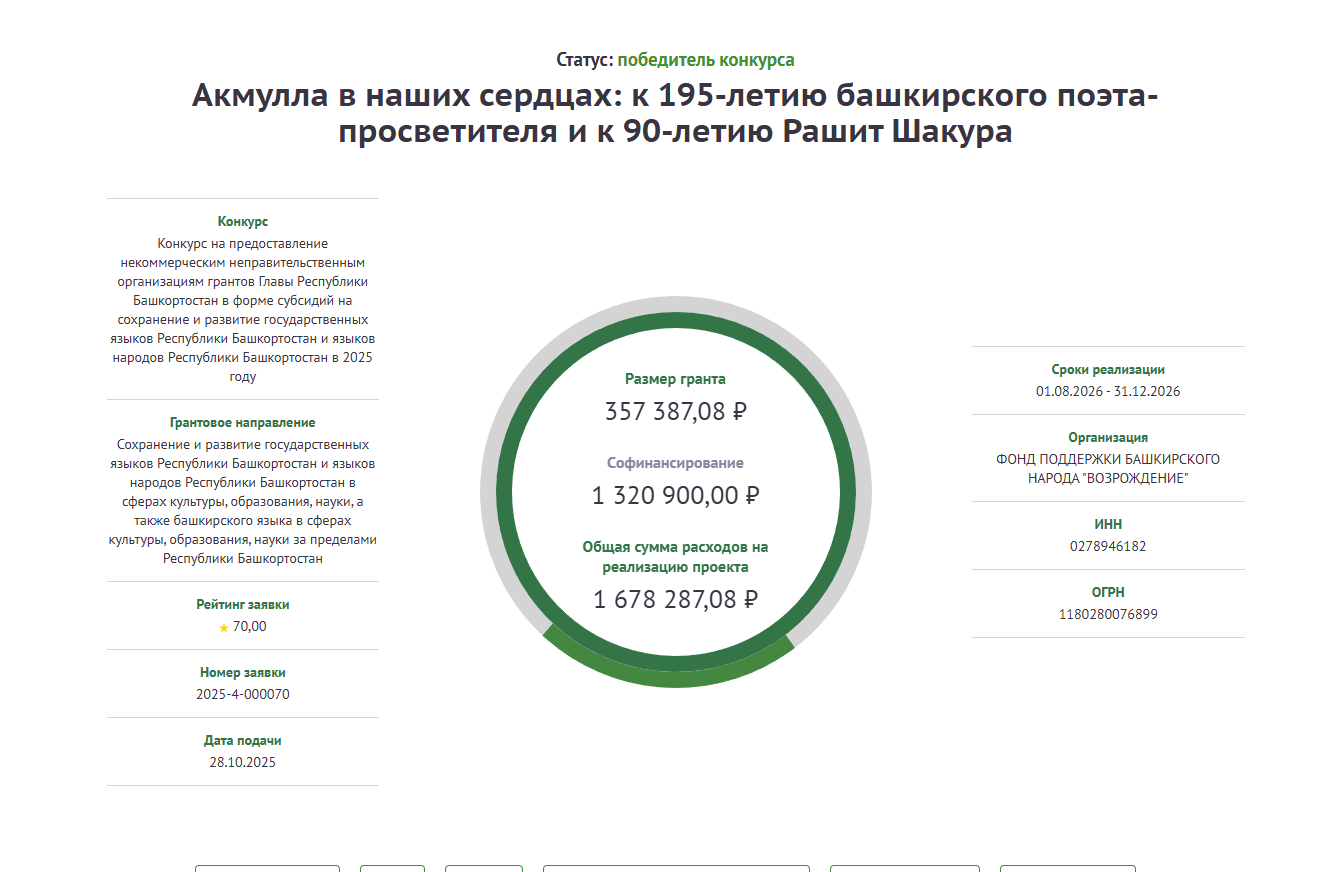 Победителем конкурса на предоставление грантов Главы Республики Башкортостан на сохранение и развитие государственных языков РБ и языков народов Республики Башкортостан в 2025 году стал просветительский проект «Акмулла в наших сердцах: к 195-летию башкирского поэта-просветителя и к 90-летию Рашит Шакура». Его разработали ученые факультета башкирской филологии Акмуллинского университета совместно с Фондом поддержки башкирского народа «Возрождение», руководитель проекта – Шаура Шакурова, старший научный сотрудник НИЦ. В рамках проекта планируется провести для студентов серию интерактивных квизов, посвященных жизни и творчеству М. Акмуллы, организовать презентацию книги профессора БГПУ им. Акмуллы Рашита Шакура «Звезда поэзии. Башкирский поэт-просветитель Мифтахетдин Акмулла», а также  провести ко Дню башкирского языка круглый стол, посвященный жизни и творчеству просветителя Акмуллы.