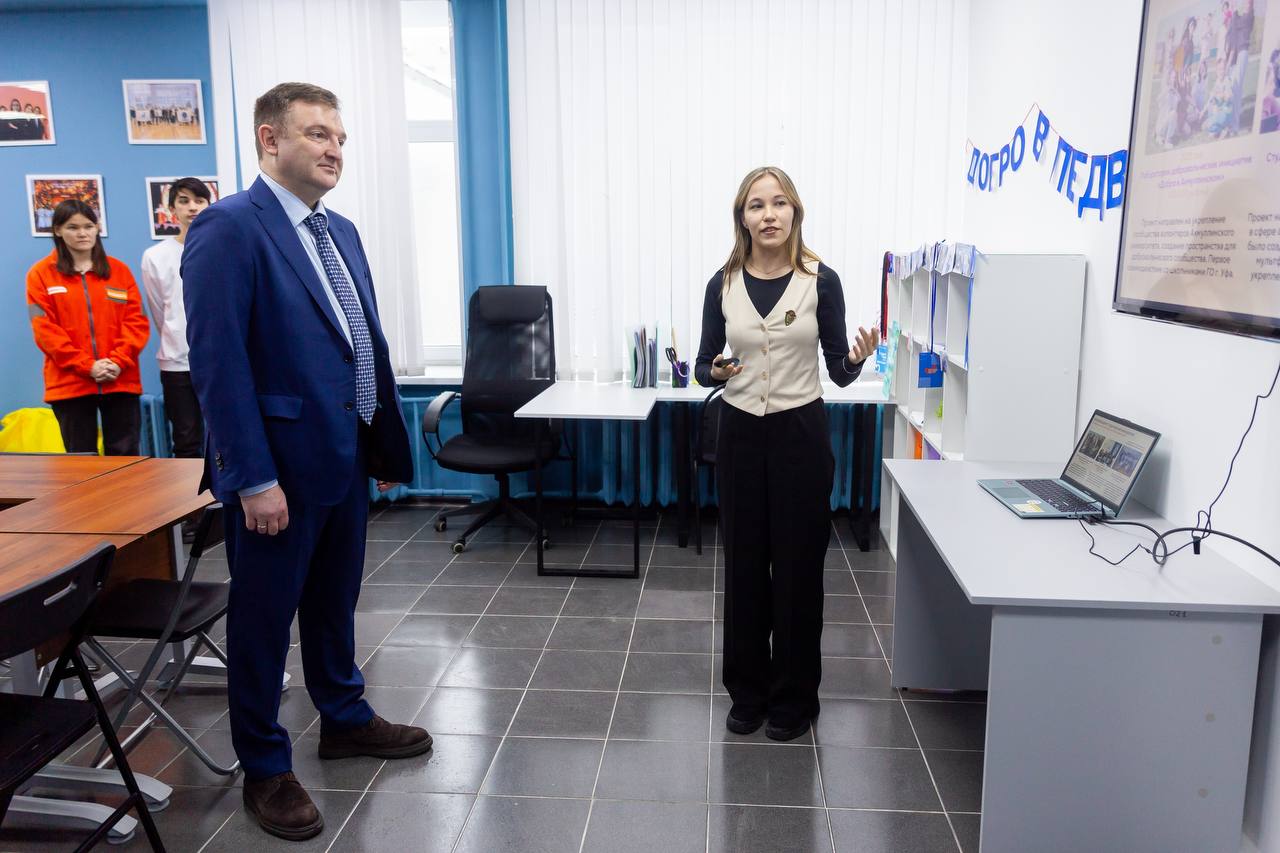 Визит представителя федерального Минпросвещения начался с фотовыставки «Как молоды мы были...», посвященной стройотрядовскому движению Республики Башкортостан. В кабинете студенческого самоуправления Александру Бугаеву руководитель волонтерского Добро.Центра Зарина Мирабдуллаева рассказала о добровольческой деятельности вуза: