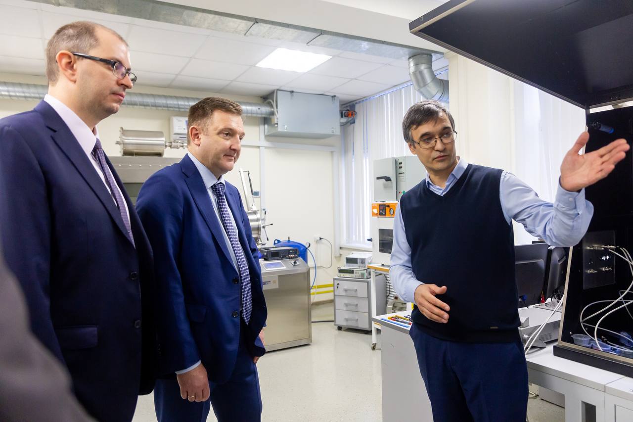 Декан ИФМЦН Азат Юсупов познакомил Александра Вячеславовича с разработками лаборатории «Наноэлектроники перспективных материалов имени А. Лачинова» и Молодежной лаборатории «Прикладная физика и технологии наносенсорики».