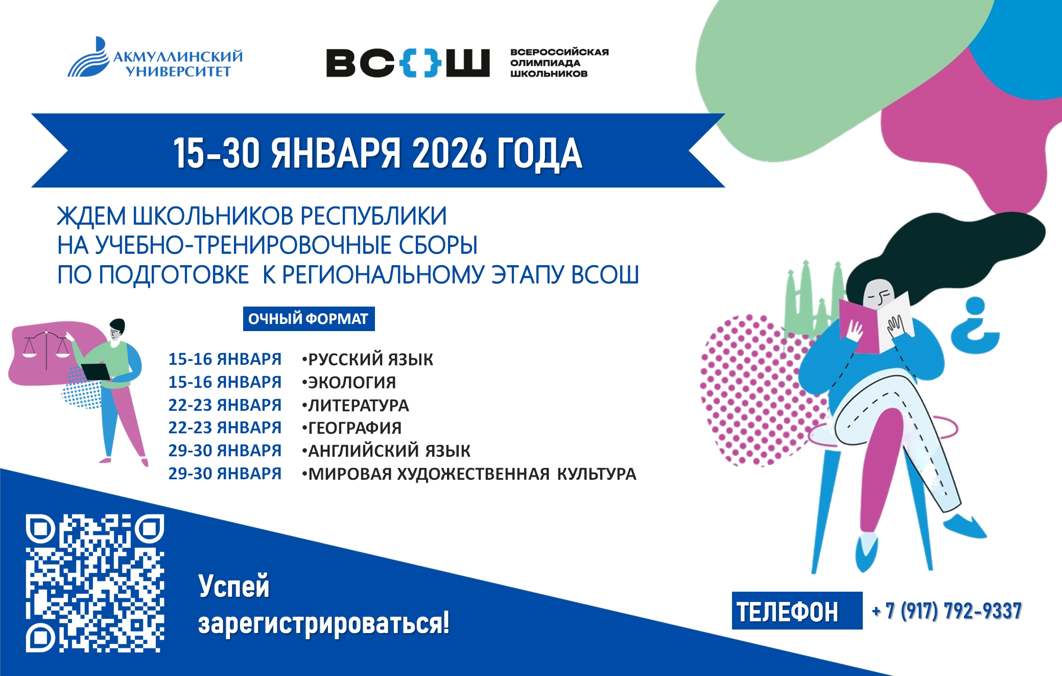 Акмуллинский университет приглашает школьников на учебно-тренировочные сборы по подготовке к региональному этапу Всероссийской олимпиады школьников.