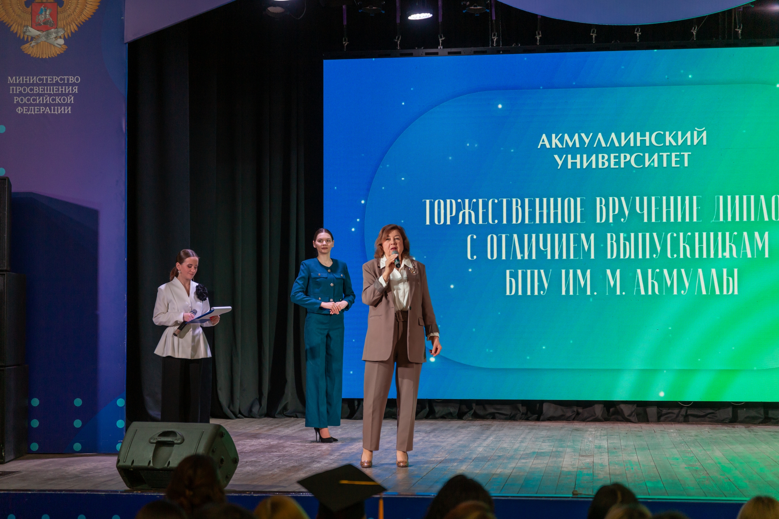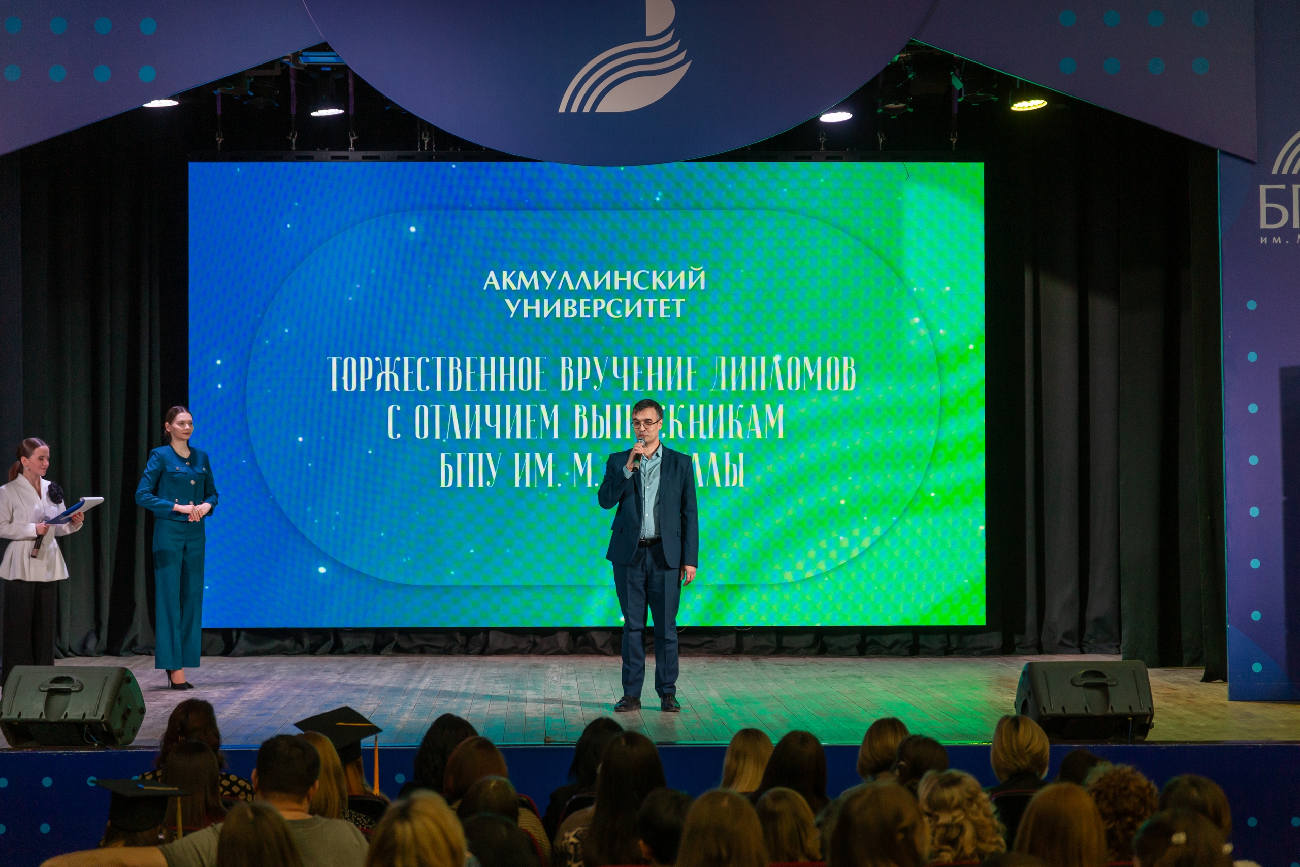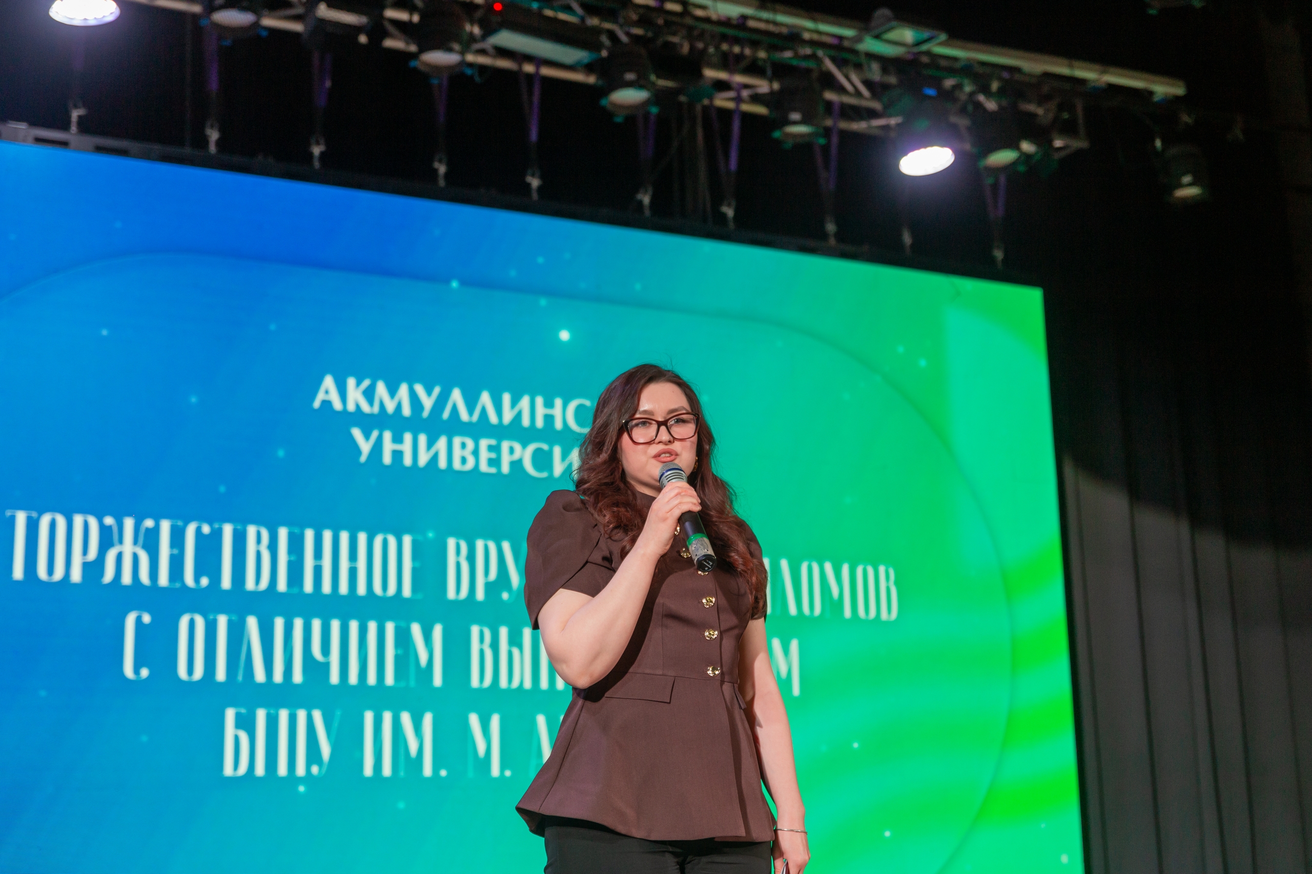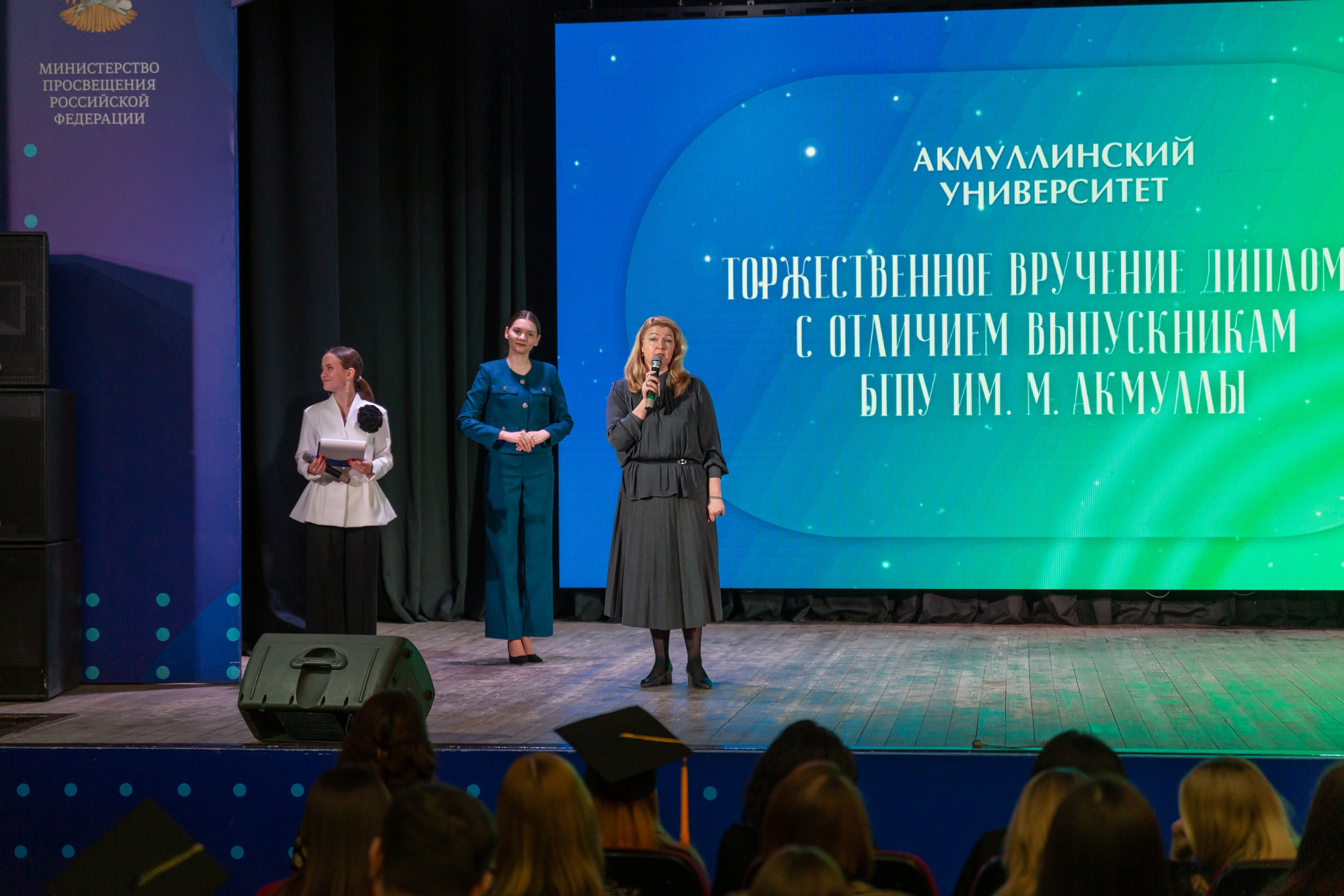 С ответным словом выступила выпускница естественно-географического факультета Екатерина Надеждина: «Быть выпускником Акмуллинского университета – значит, быть частью огромной профессиональной семьи. И для нас это огромная честь и очень большая ответственность. Хочется выразить искреннюю благодарность нашим преподавателям, которые день за днём и шаг за шагом вели нас к этому знаменательному событию. Мы желаем, чтобы к вам приходили только лучшие студенты, а вы их делали ещё лучше. Ведь на нашем примере это получилось отлично! Огромное вам спасибо за знания, которые вы нам дали, и низкий вам поклон, уважаемые педагоги».