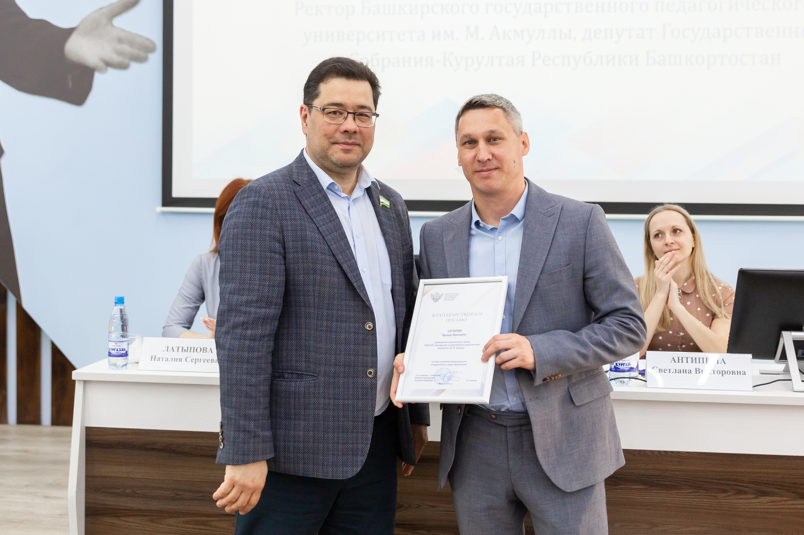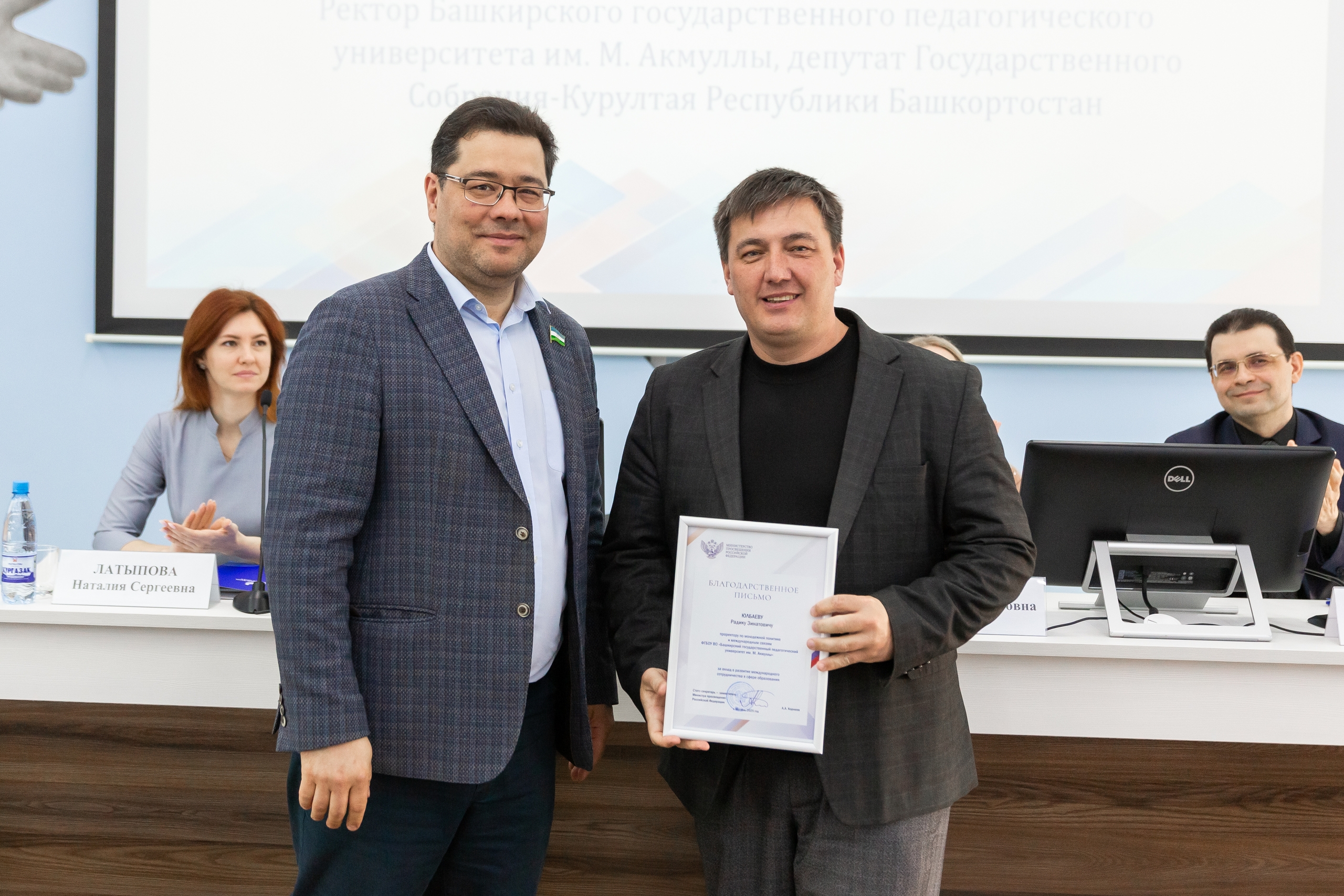 Ректор вуза Салават Сагитов вручил благодарственные письма Министерства просвещения России за вклад в развитие международного сотрудничества в сфере образования лаборанту кафедры русского языка, теоретической и прикладной лингвистики Гульнур Сабитовой, доценту кафедры русского языка, теоретической и прикладной лингвистики Юлии Фоминой, руководителю аналитического центра Эдуарду Саттарову  и проректору по молодежной политике и международным связям Радику Юлбаеву. Этими наградами отмечена работа коллег по продвижению русского языка и российского образования в Кыргызстане, которую коллектив университета ведет по заданию Минпросвещения РФ.