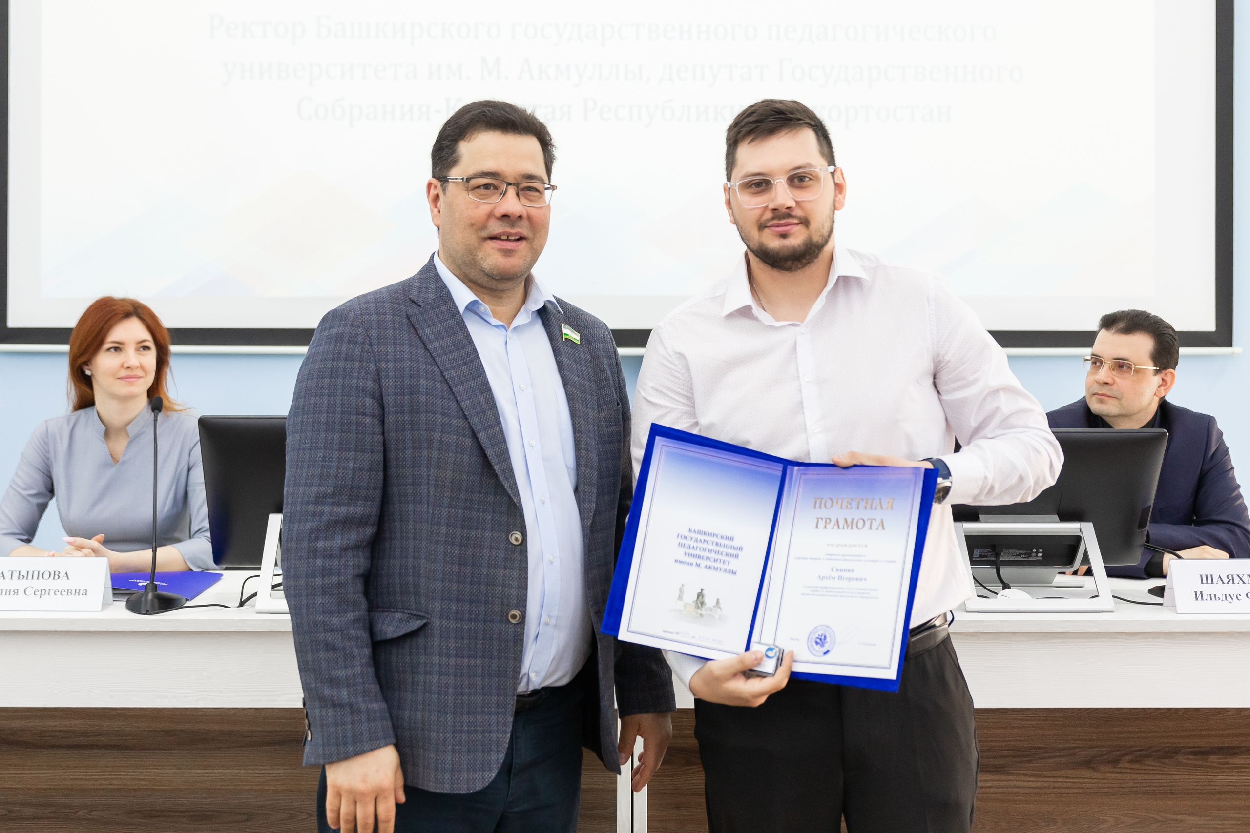 Почетными грамотами Акмуллинского университета были отмечены старший преподаватель кафедры экологии, географии и природопользования Линара Шугаипова, старший преподаватель кафедры теории и методики физической культуры и спорта Артём Свинин специалист по научной работе отдела научной работы Азалия Султанова.
