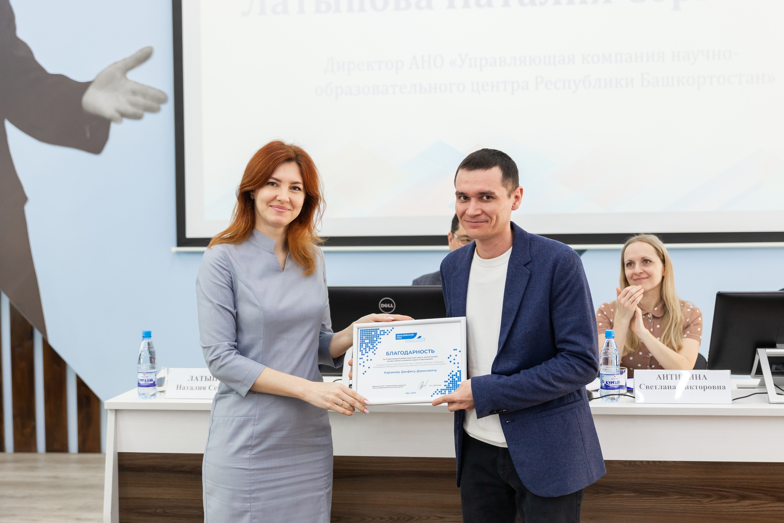 Благодарственные письма Евразийского НОЦ за плодотворный добросовестный труд и значительный вклад в области развития науки и образования вручила директор Управляющей компании НОЦ РБ Наталия Латыпова. Награды получили старшие научные сотрудники Молодёжной лаборатории «Прикладная физика и технологии наносенсорики» Галия Байбулова и  Данфис Карамов, старший научный сотрудник научно-исследовательской лаборатории молекулярной систематики фототрофных микроорганизмов им.Л.С.Хайбуллиной Ренганатхан Прабхахаран.