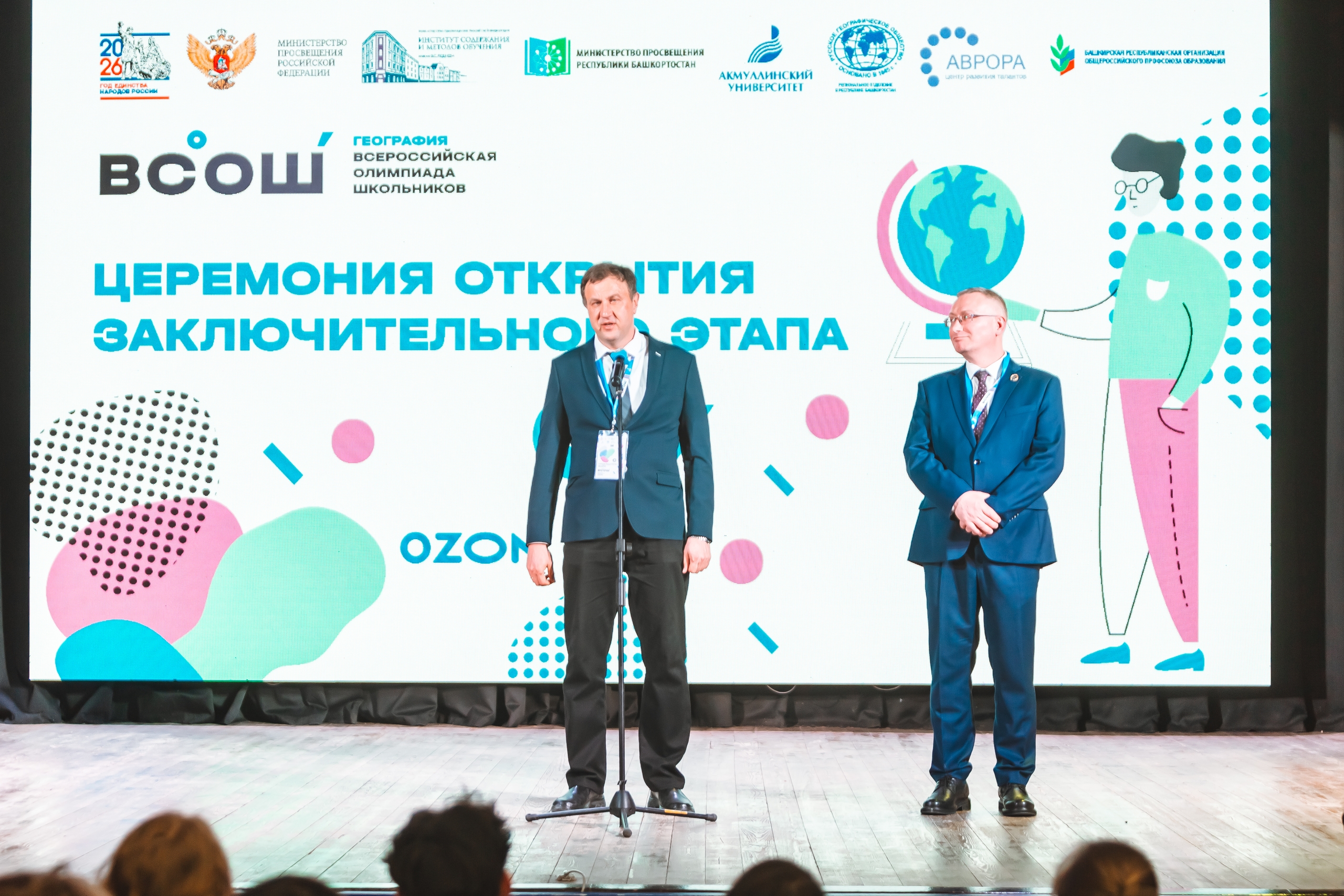 На церемонии открытия присутствовали заместитель министра просвещения Республики Башкортостан Светлана Антипина, первый проректор по стратегическому развитию Акмуллинского университета Алмаз Мустаев, представитель от уполномоченной организации Института содержания и методов обучения имени В.С. Леднева, старший научный сотрудник Центра социально-гуманитарного общего образования им. Л. Боголюбова Элеонора Амбарцумова, председатель жюри заключительного этапа, профессор кафедры экологии, географии и природопользования Башкирского государственного педагогического университета им. М. Акмуллы Глеб Зайцев, члены жюри, участники олимпиады и сопровождающие их педагоги.