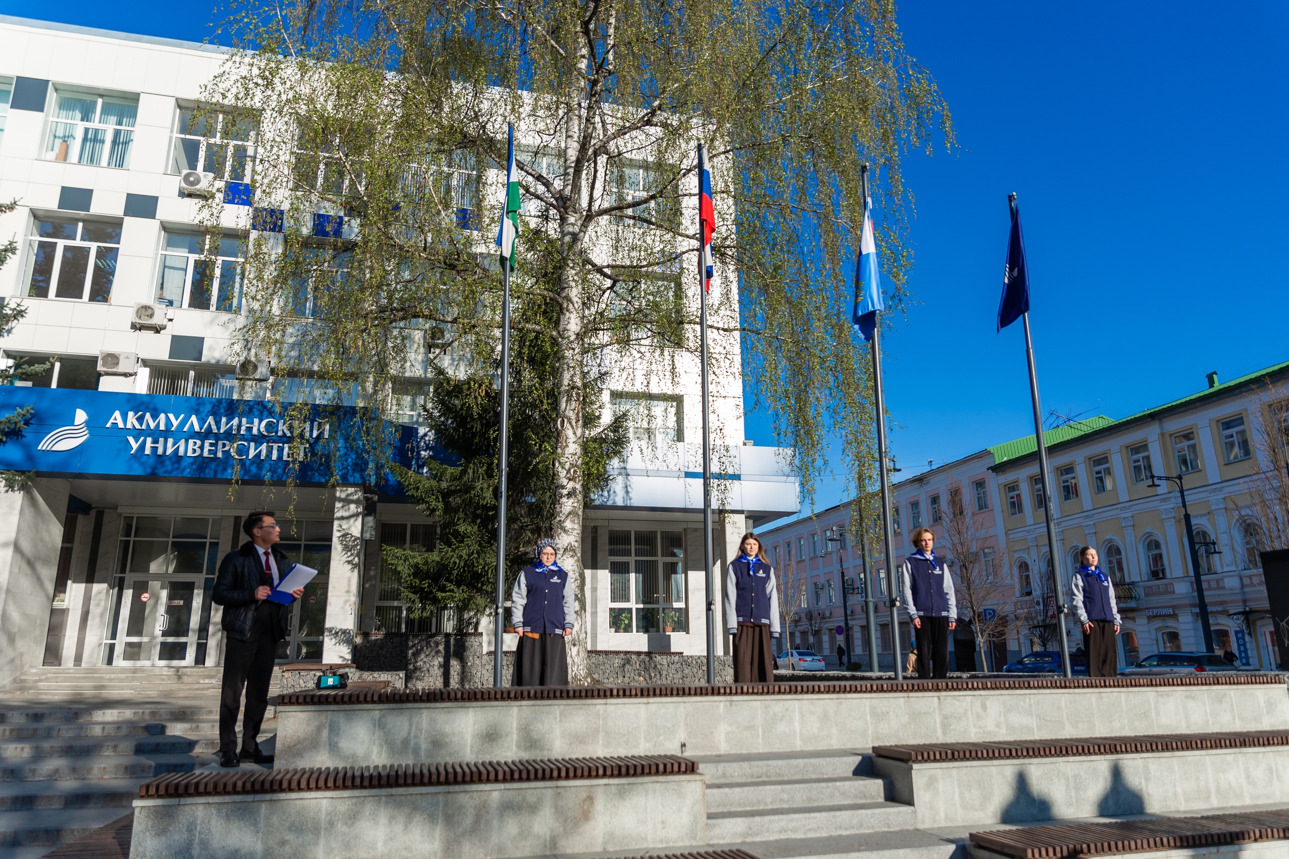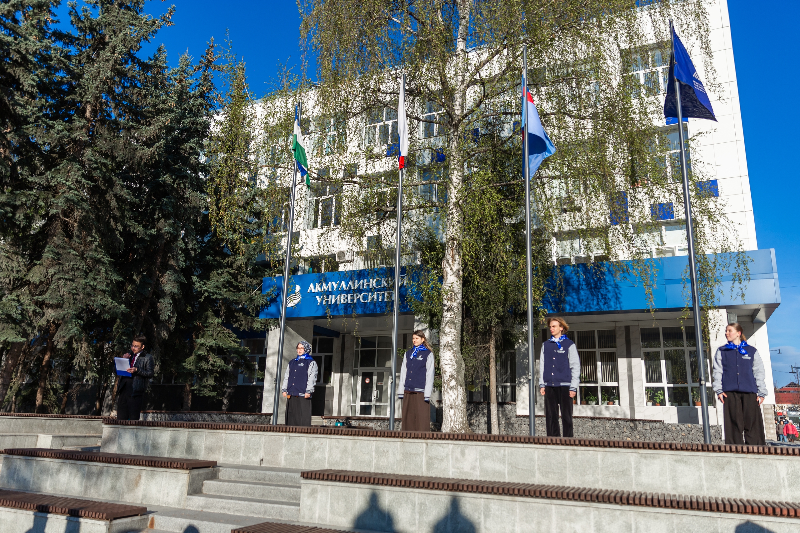 27 апреля в Акмуллинском университете состоялась еженедельная торжественная церемония поднятия государственных флагов Российской Федерации, Республики Башкортостан, флагов Министерства просвещения России и БГПУ им. М. Акмуллы. Участниками ее стали студенты и преподаватели Акмуллинского колледжа.
