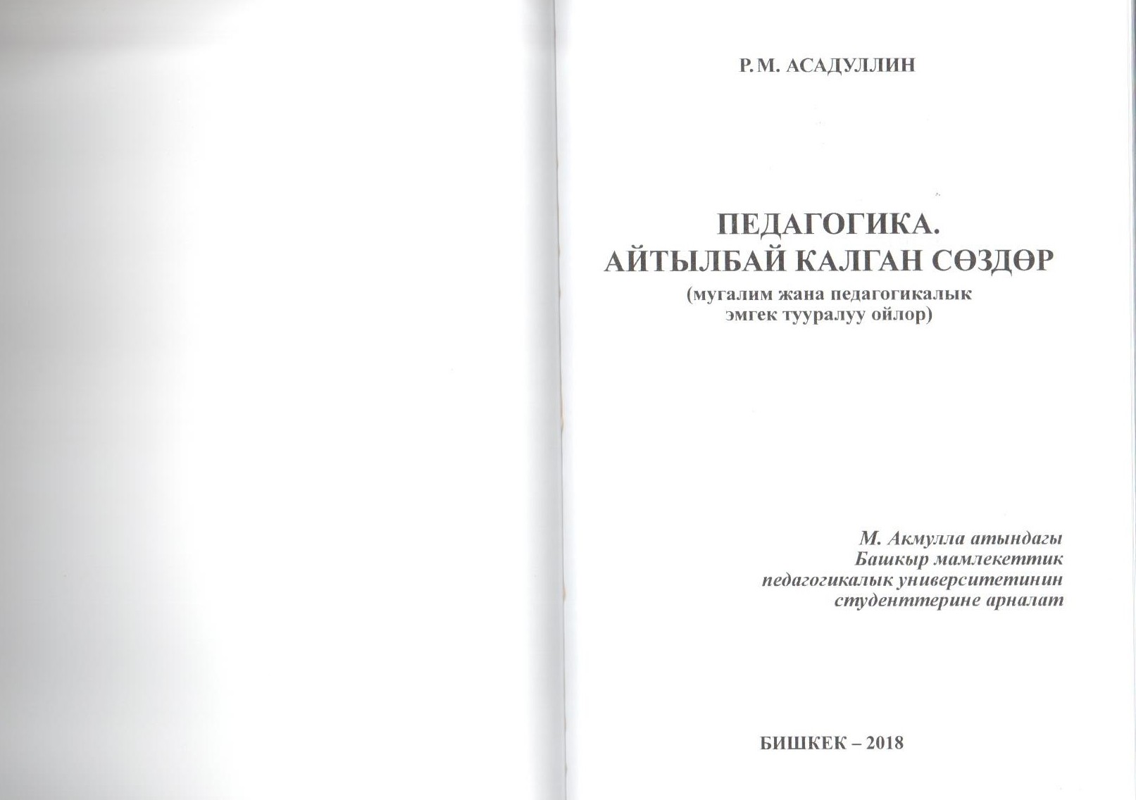 При поддержке Кыргызского национального университета им.Ж.Баласагына вышла в свет книга «Педагогика. Недосказанное», переведенная на киргизский язык, ректора Башкирского государственного педагогического университета им.М.Акмуллы Раиля Мирваевича Асадуллина. Данное произведение автор посвятил студентам родного университета и, как отмечено в предисловии, «педагогам и всем, кому не безразличны проблемы воспитания и обучения».