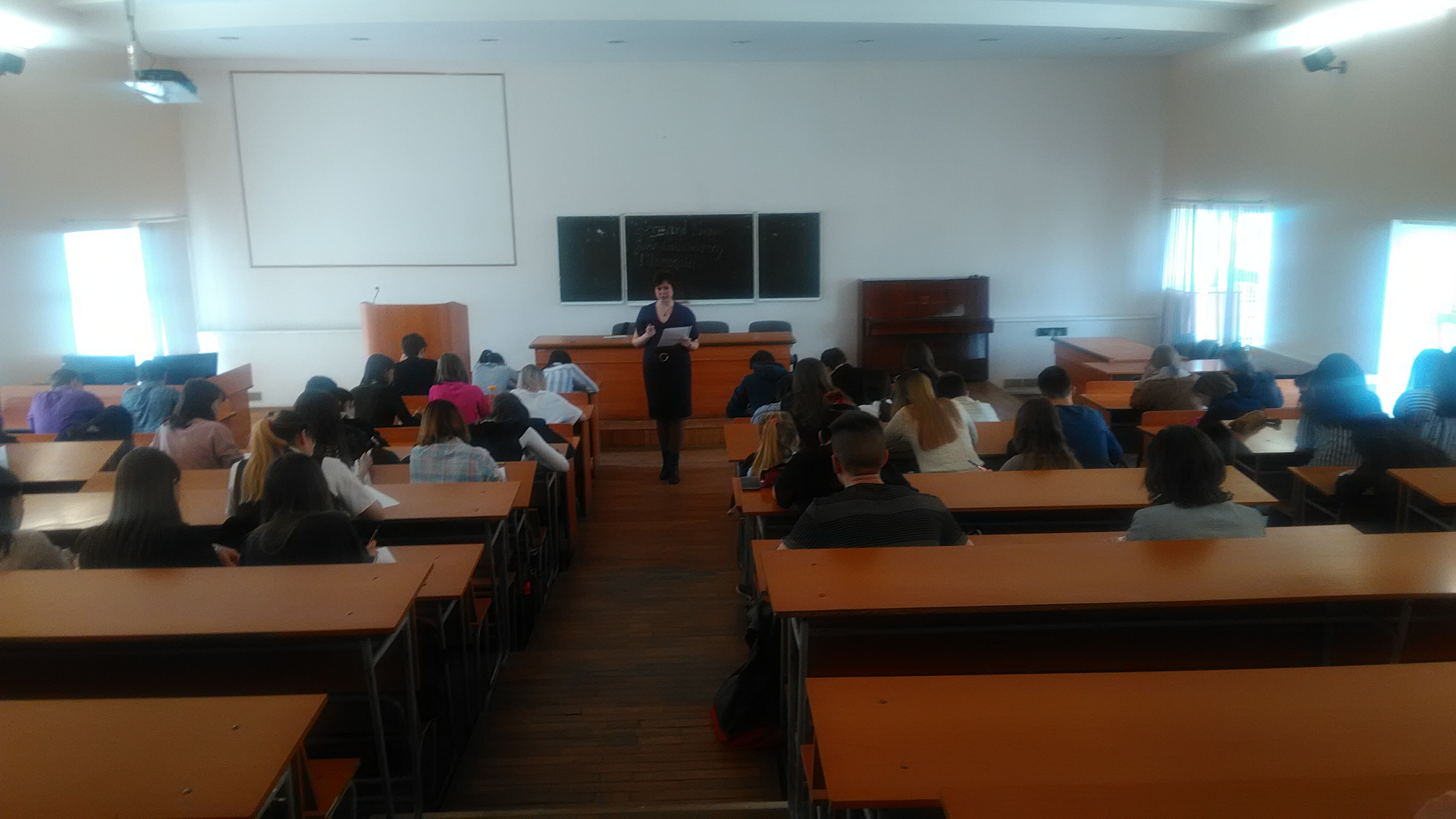 Диктант приурочен ко дню рождения Уильяма Шекспира. Ребятам был предложен интересный рассказ о театрах Великобритании, который зачитали доцент кафедры английского языка, к. ф. н. Никулина Алла Константиновна и доцент кафедры английского языка, к. ф. н. Абдюшева Светлана Азаматовна. Активное участие в организации мероприятия приняли  студенты 205 и 204 групп (под руководством ассистента кафедры английского языка Васильевой  Виктории Петровны).