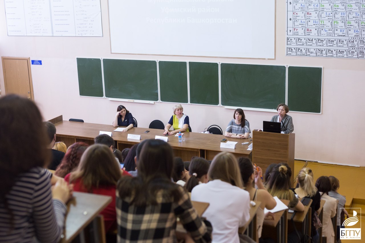 «День знакомства с работодателями». Целевая аудитория: студенты выпускных курсов.  Прошли две глобальные встречи. Студенты, получающие психолого-педагогическое образование, встретились с представителями республиканской системы образования. Перед ними выступили    Проняева Эмма Ильгизовна – главный специалист Управления образования Администрации ГО г. Уфа РБ; Басырова Зульфия Ишбулатовна – главный специалист Управления образования Администрации МР Уфимский район РБ; Будрина Наталья Германовна – старший методист Колледжа БГПУ им. М.Акмуллы. Спикеры осветили особенности и специфику работы в различных образовательных учреждениях: городских, сельских и малокомплектных школах, в учреждениях среднего профессионального образования и сфере дополнительного образования детей. Будущие педагоги получили нормативно-правовую консультацию о правах и обязанностях молодого специалиста, сроках получения гарантированных выплат и ошибках, которые ежегодно совершают молодые люди при трудоустройстве.