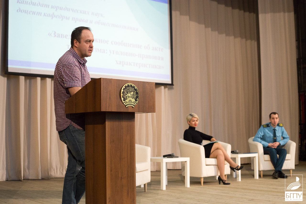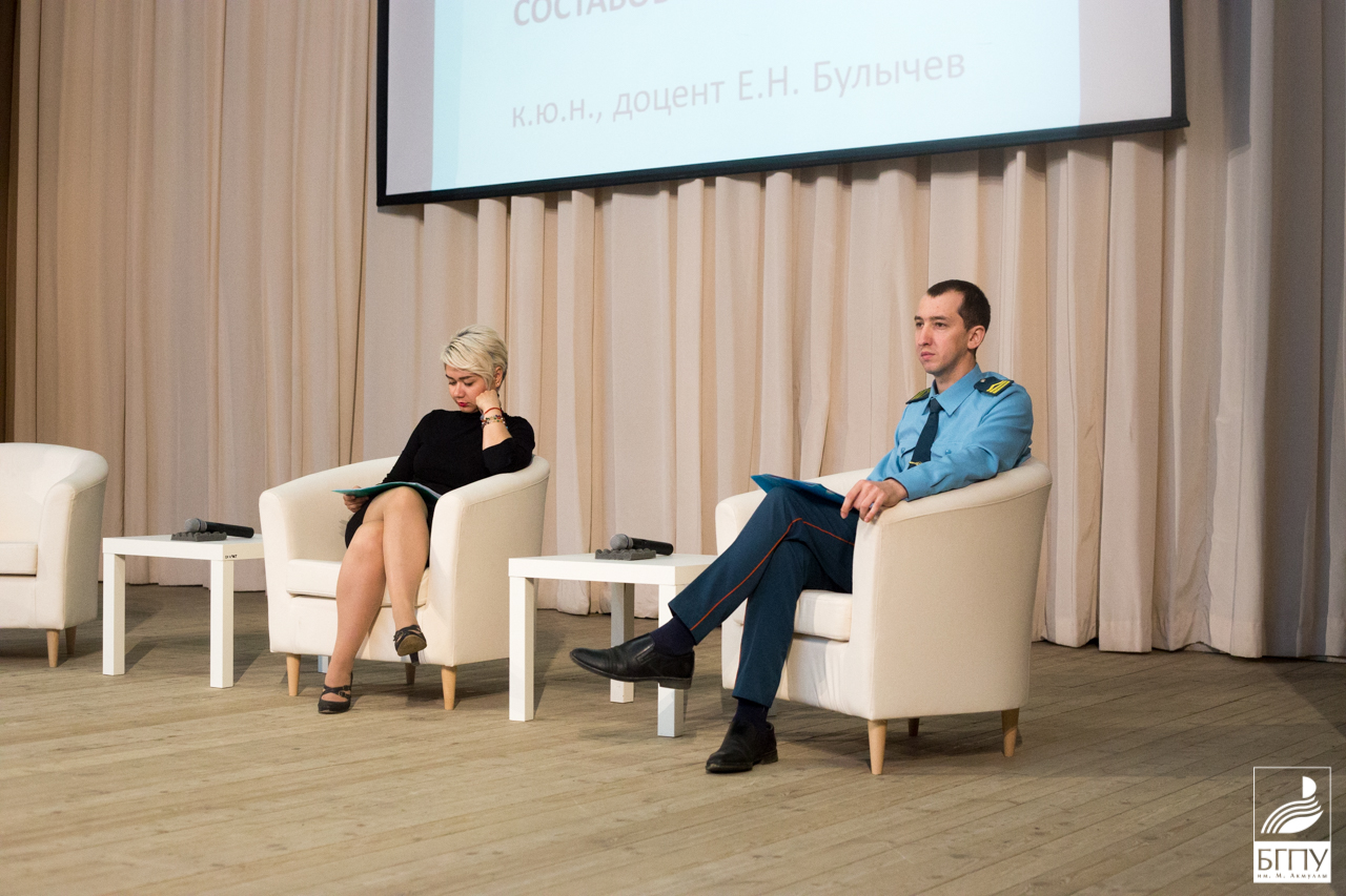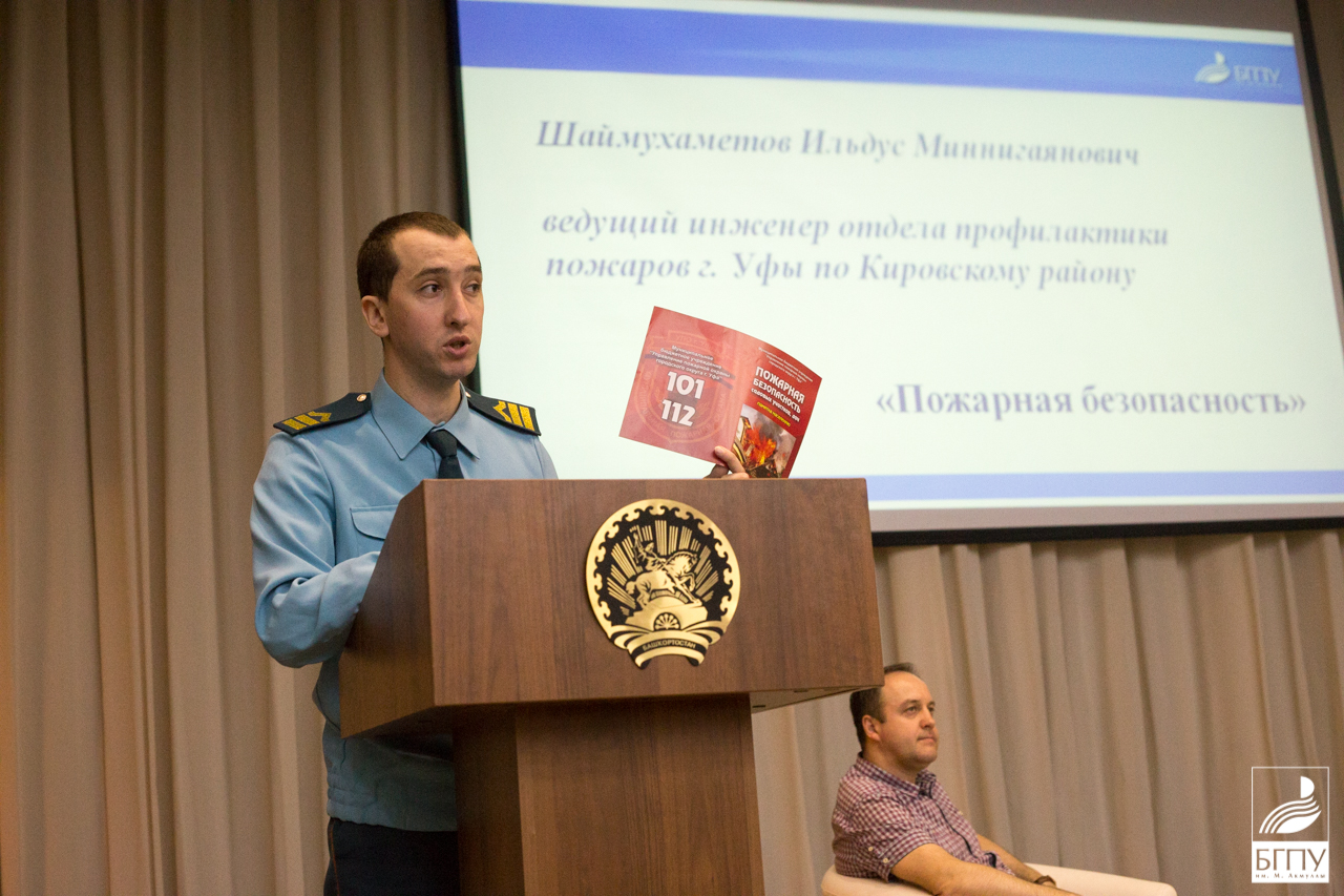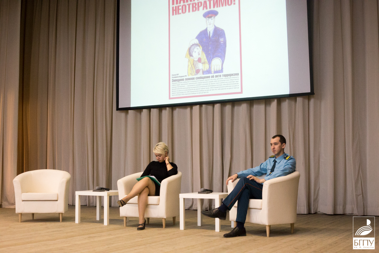 Булычёв Евгений Николаевич, кандидат юридических наук, доцент кафедры права и обществознания представил развернутое выступление на тему «Заведомо ложное сообщение об акте терроризма: уголовно-правовая характеристика, состав и отличие от иных смежных составов преступления». Использованный им иллюстративный материал может быть использован студентами при работе с обучающимися школьного возраста, что востребовано в период работы вожатыми. Гафурова Альфия Шамилевна, ведущий юрисконсульт юридического отдела университета озвучила вопрос «Антикоррупционная деятельность в университете». Шаймухаметов Ильдус Миннигаянович, ведущий инженер отдела профилактики пожаров г. Уфы по Кировскому району, остановился на ключевых вопросах обеспечения пожарной безопасности в быту, на рабочем месте, в общественных местам и местах массового скопления людей.
