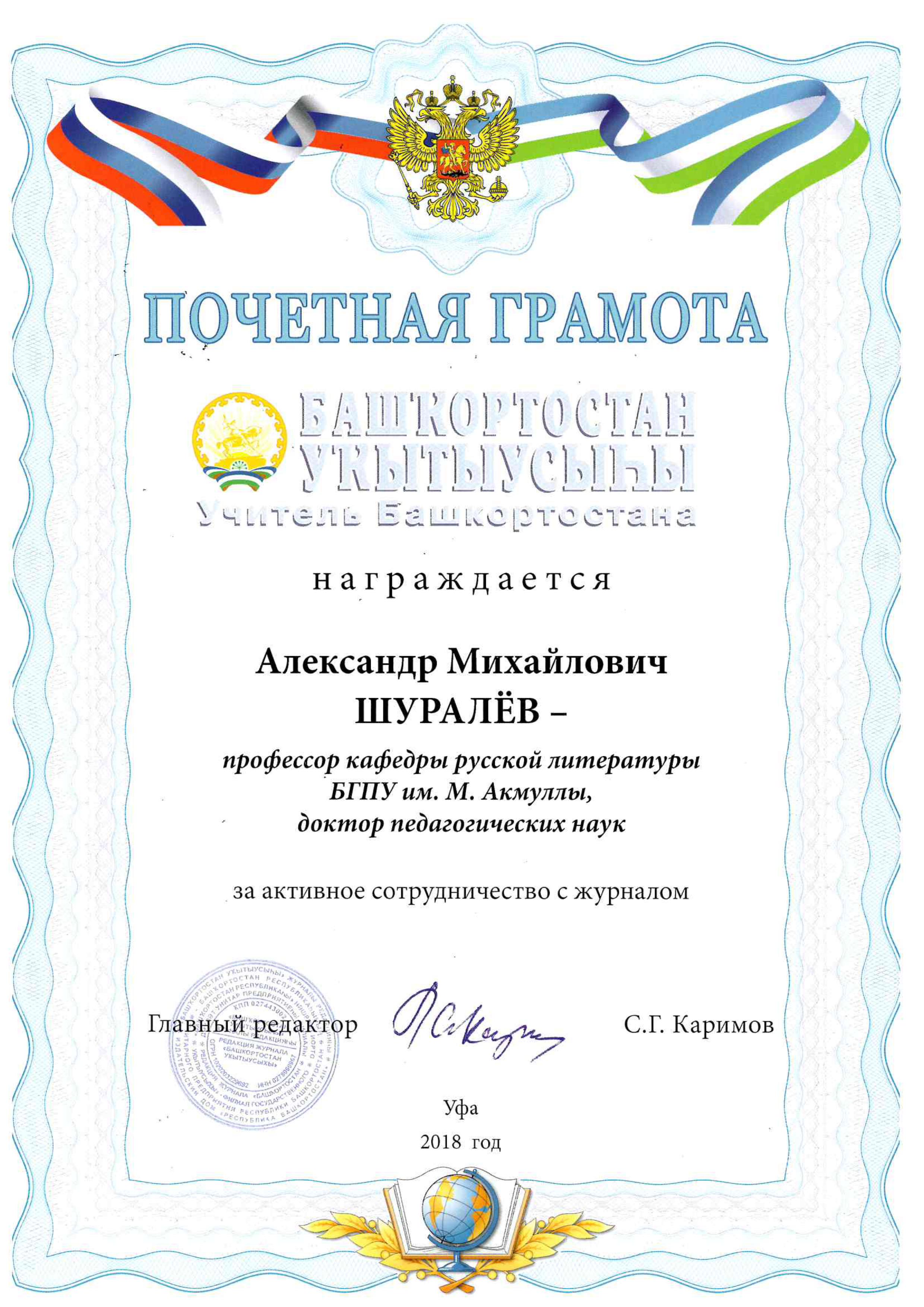 Профессор кафедры русской литературы, доктор педагогических наук Александр Михайлович Шуралев награжден почетной грамотой журнала "Учитель Башкортостана" за качественную подготовку материалов для интегрированного изучения русской и башкирской литератур.