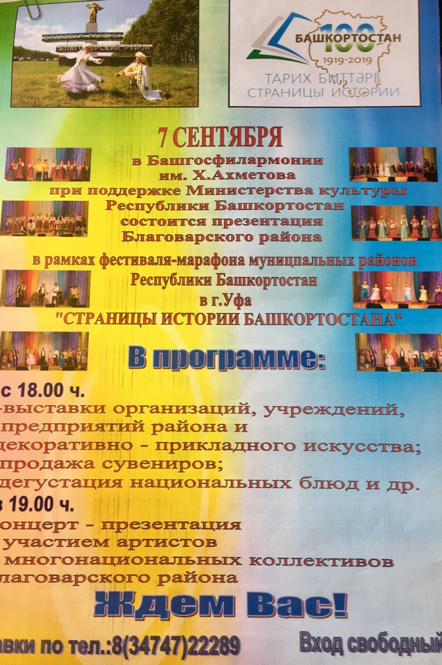 7 сентября 2018 года в Башкирской государственной филармонии им. Х. Ахметова в рамках фестиваля-марафона муниципальных образований «Страницы истории Башкортостана», посвященного 100-летию образования республики, при поддержке Министерства культуры Республики Башкортостан пройдет презентация Благоварского района.