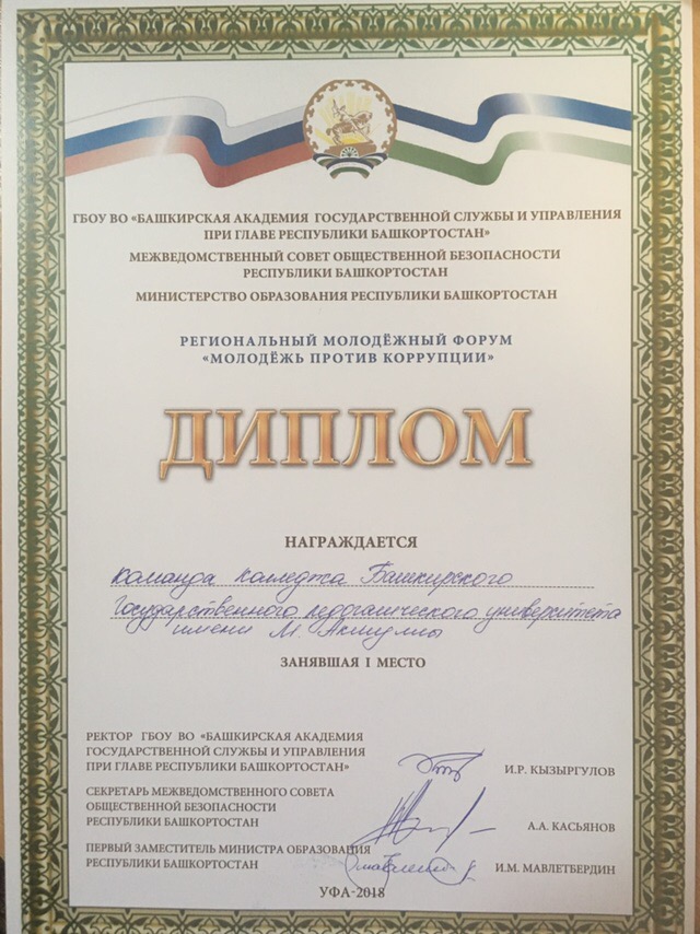 Команда Колледжа БГПУ им.М.Акмуллы, представленная студентами третьего курса специальности «Право и организация социального обеспечения», заняла первое место в командно-деловых играх в рамках прошедшего 9 ноября 2018 года регионального форума «Молодежь против коррупции». Участникам было предложено решить ситуационные задачи (кейсы). Капитан команды Давид Кишмария награжден дипломом в номинации «Лучший спикер командных соревнований».