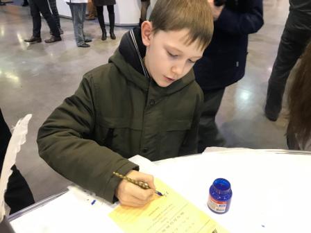Волонтёры провели акцию «Каллиграфическое письмо»: рассказали об особенностях каллиграфии, об истории пера. Среди школьников и студентов было очень много желающих написать себе письмо гусиным пером. Старшее поколение посетителей поделилось с волонтёрами воспоминаниями о своих школьных годах, когда им приходилось писать перьевыми ручками.