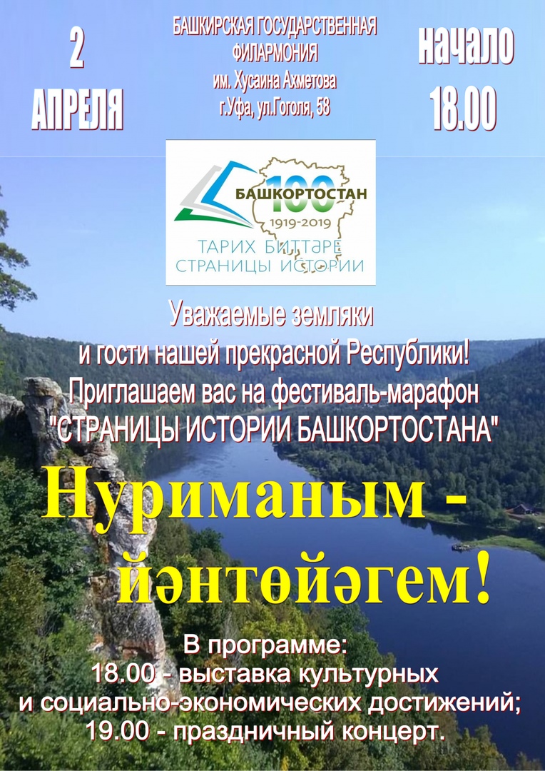 2 апреля 2019 года в Башкирской государственной филармонии им. Х. Ахметова (г. Уфа, ул. Гоголя, 58) пройдёт презентация Нуримановского района в рамках фестиваля-марафона муниципальных образований республики «Страницы истории Башкортостана», посвященного 100-летию образования Республики Башкортостан.