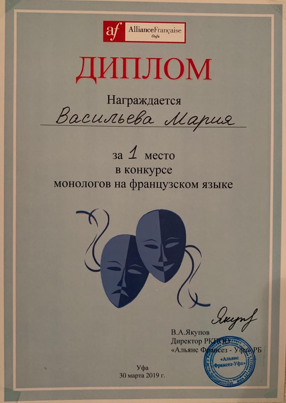30 марта 2019 года студентка 4 курса французского отделения ИФОМК Васильева Мария стала победителем конкурса монологов, организованного Региональной культурно-просветительской организацией «Альянс Франсез – Уфа». Конкурс монологов на французском языке проводился в рамках Года театра при поддержке Посольства Франции в РФ и Institut français. Участники Регионального конкурса представили на суд публики и жюри театральную миниатюру в форме монолога, подготовленную на основе произведения франкофонного автора.