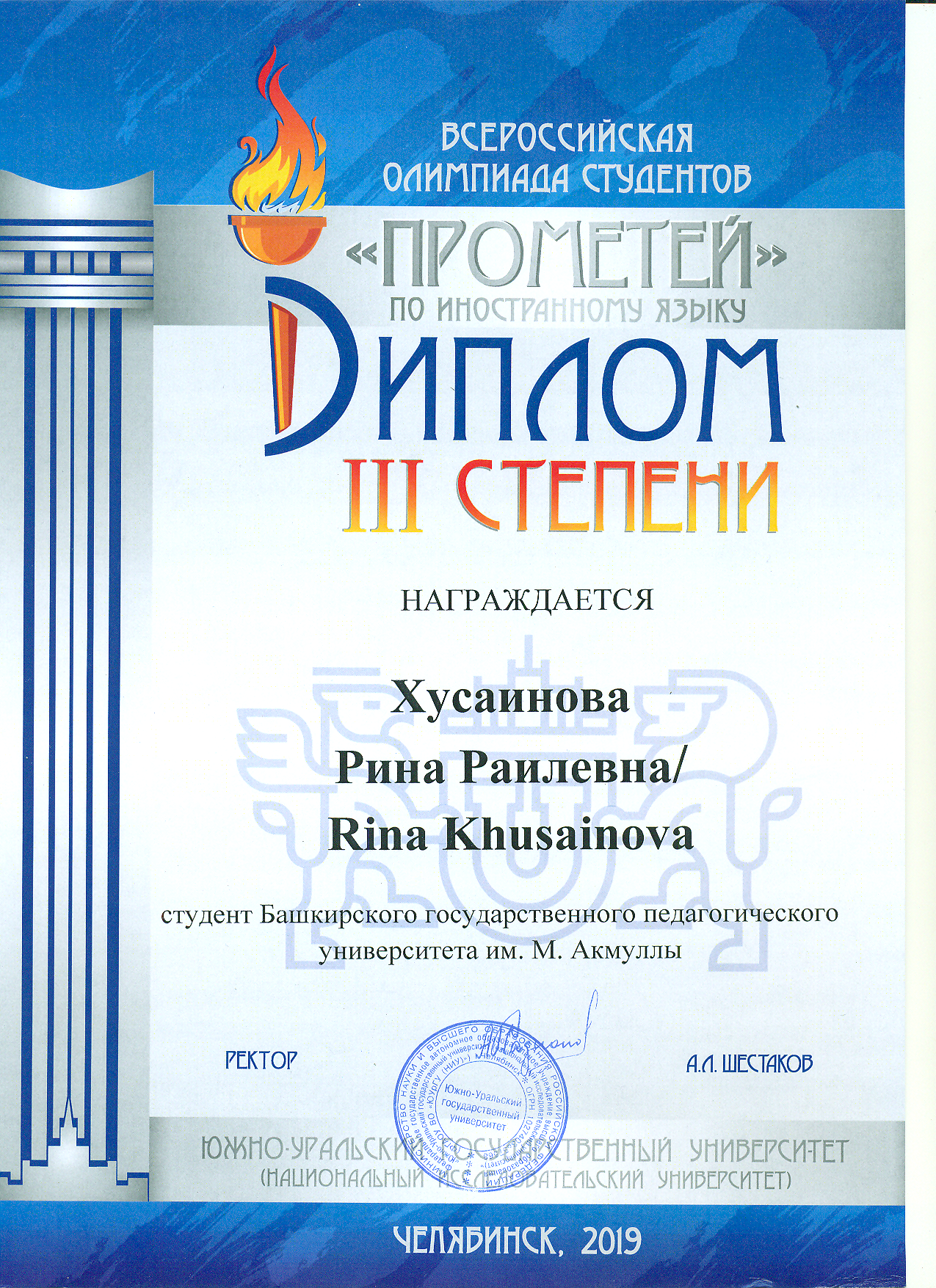 Студентка 1 курса ИИПО Хусаинова Р.Р. стала призером Всероссийской студенческой олимпиады по иностранным языкам «Прометей», которая проходила в ФГАОУ ВО «Южно-Уральский государственный университет (Национальный исследовательский университет)» (г. Челябинск). Рина награждена диплом III степени.