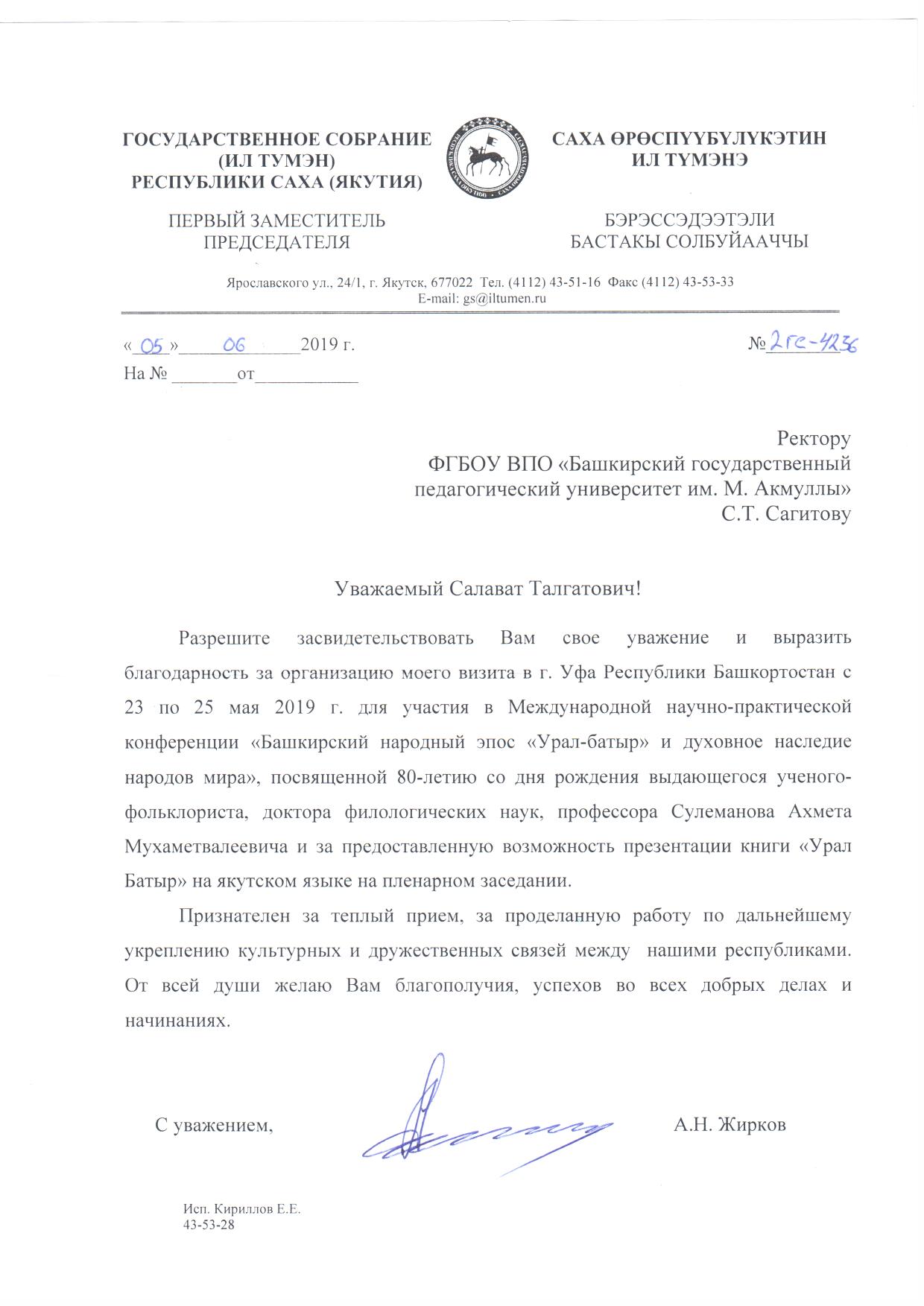 Первый вице-спикер Госсобрания (Ил Тумэн) Республики Саха (Якутия) А.Н. Жирков выразил благодарность врио ректора БГПУ им. М. Акмуллы С.Т. Сагитову за организацию визита в г. Уфа с 23 по 25 мая 2019 года на Международную научно-практическую конференцию "Башкирский народный эпос "Урал-батыр" и духовное наследие народов мира".