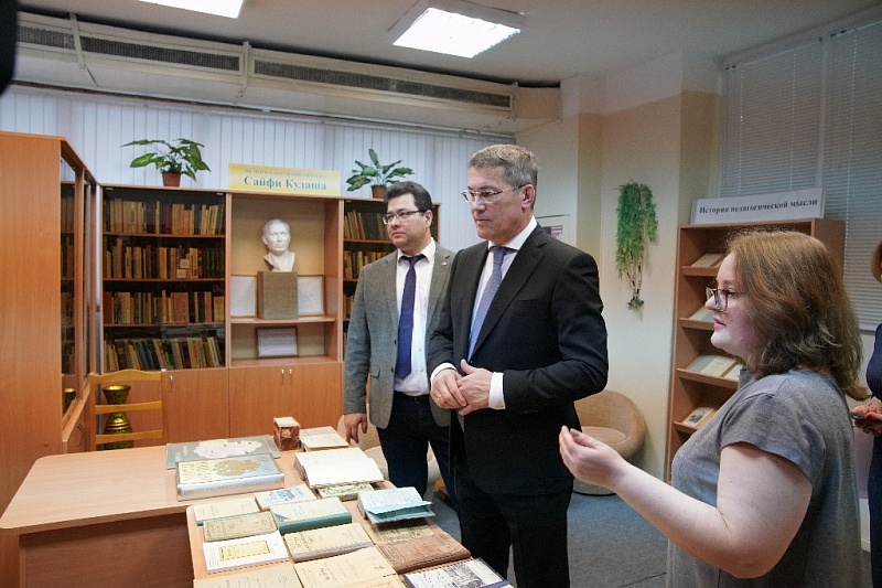 Глава республики обсудил с ректором потребность школ региона в учителях и современные методики преподавания башкирского языка, разработанные вузом, а также побывал в отделе редких книг.