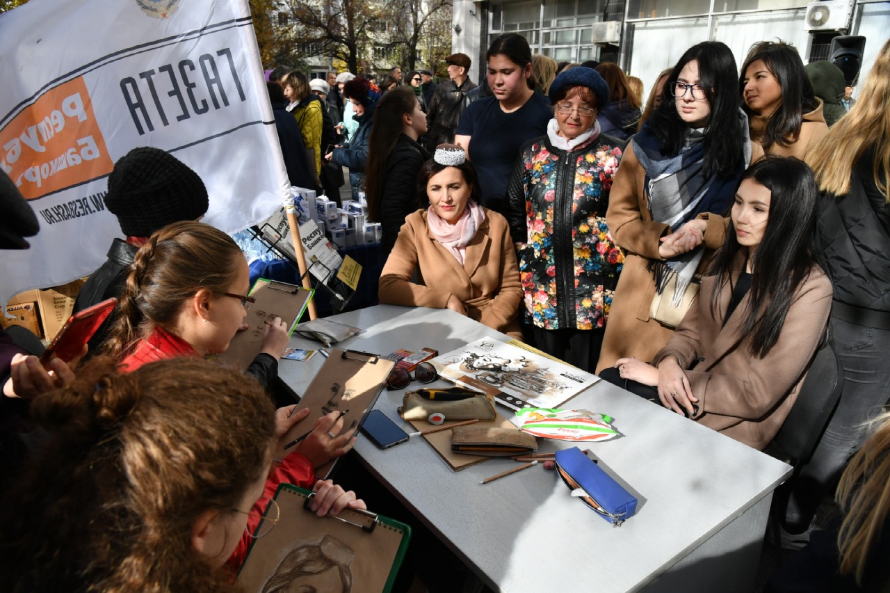 Студенты художественно-графического факультета 2 курса, направления Дизайн рисовали портреты и шаржи для подписчиков газеты Республика Башкортостан. За короткое время студентам удалось выполнить большое количество портретов, а количество желающих запечатлеть себя на бумаге не убавлялось.