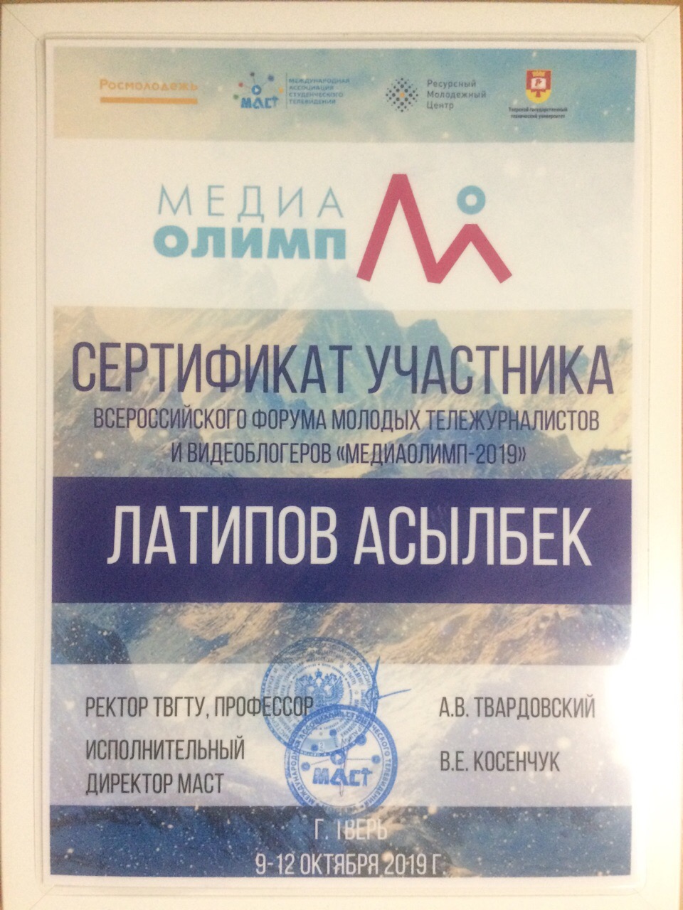 В октябре 2019 года под эгидой Федерального агенства по делам молодежи (Росмолодежь), главной задачей которого является развитие молодых граждан России, прошел всероссийский форум молодых тележурналистов и видеоблогеров "Медиа Олимп-2019". Это – образовательная площадка для создателей видеоконтента, которая объединит молодых тележурналистов, операторов, монтажеров, блогеров, представителей студенческих медиацентров из разных регионов России. На форум съехалось более 120 участников. Одним из участников форума стал студент 3 курса Института физики, математики, цифровых и нанотехнологий Латипов Асылбек. Поездка на форум стала возможной благодаря сертификату, который в 2018 году вручил ректор БГПУ им. М. Акмуллы Сагитов Салават Талгатович. Сертификат возмещал затраты на участие в другом Всероссийском молодежном форуме за особый вклад в развитие добровольческого движения. На форуме были проведены мастер-классы от профессионалов из федеральных СМИ, телеканалов, медиаспециалистов и практические занятия, по итогам которых участники создавали ролики, сюжеты, видеоматериалы. Общая тематика творческих работ - "Герои труда", была посвящена людям рабочих профессий. Асылбек принимал участие на форуме "Медиа Олимп 2019" в качестве оператора-монтажера и подготовил видеоролик о работе "Ростелеком". Участие наших студентов в мероприятиях подобного уровня развивают их не только как профессионалов в области медиа, но вносят вклад в продвижении ВУЗа. Мы гордимся такими студентами.