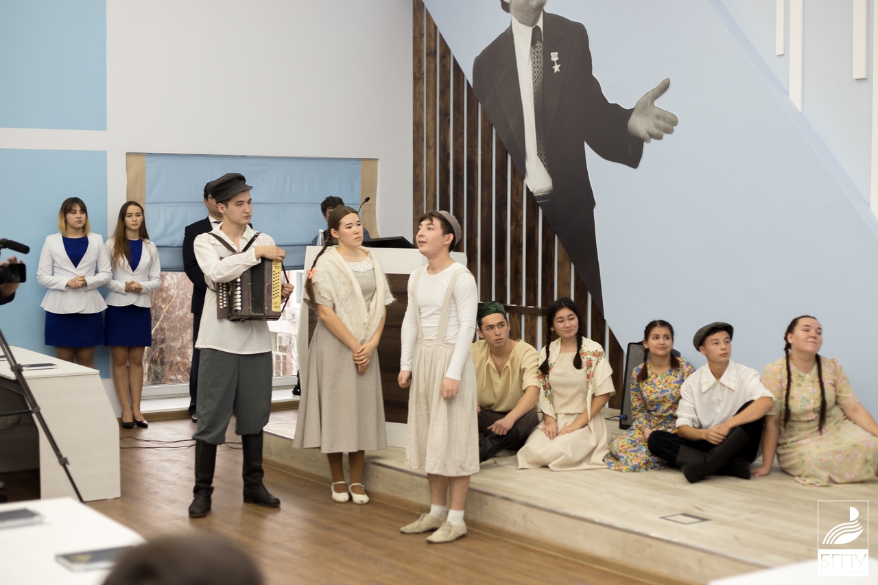 Заместитель министра культуры и туризма Республики Калмыкия Николай Санджиев поделился своими воспоминаниями о Мустае Кариме и презентовал  университету фотографию с премьеры спектакля «В ночь лунного затмения» в Калмыцком драматическом театре им. Б. Басангова, прошедшей в 1966г.