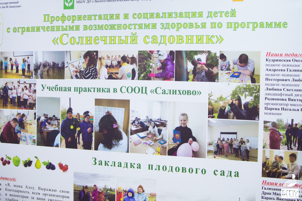 Здесь был представлен проект «Солнечный садовник», реализуемый при поддержке Федерального агентства по делам молодежи. «Солнечный садовник» – совместная работа специалистов психологии, арт-терапии и преподавателей садоводства. Цель этого проекта – дать детям с ОВЗ из уфимской коррекционной школы №59 первоначальную профессиональную подготовку в области садоводства, помочь им в дальнейшей социализации и получении профессии. Для этого и объединились педагоги эколого-биологического центра «Лидер ЭКО», студенты естественно-географического факультета и Института педагогики БГПУ, волонтеры-учащиеся уфимских школ №62, 116 и 79.