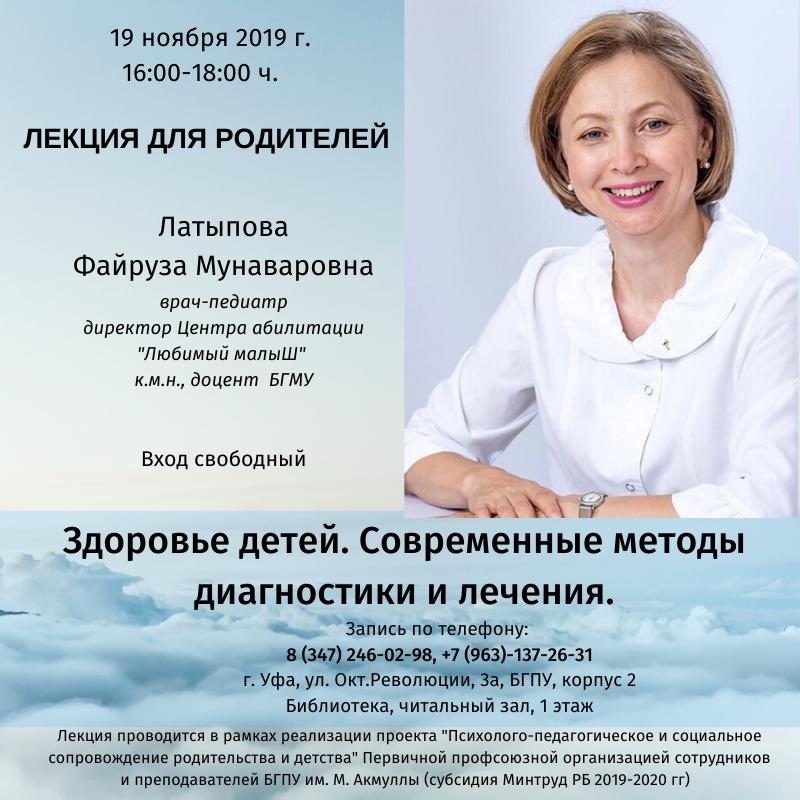 19 ноября 2019 года в читальном зале библиотеки 2 корпуса БГПУ им. М. Акмуллы прошла лекция для родителей «Здоровье детей. Современные методы диагностики и лечения». Перед слушателями выступила врач-педиатр Файруза Мунаваровна Латыпова, к.м.н., доцент БГМУ.