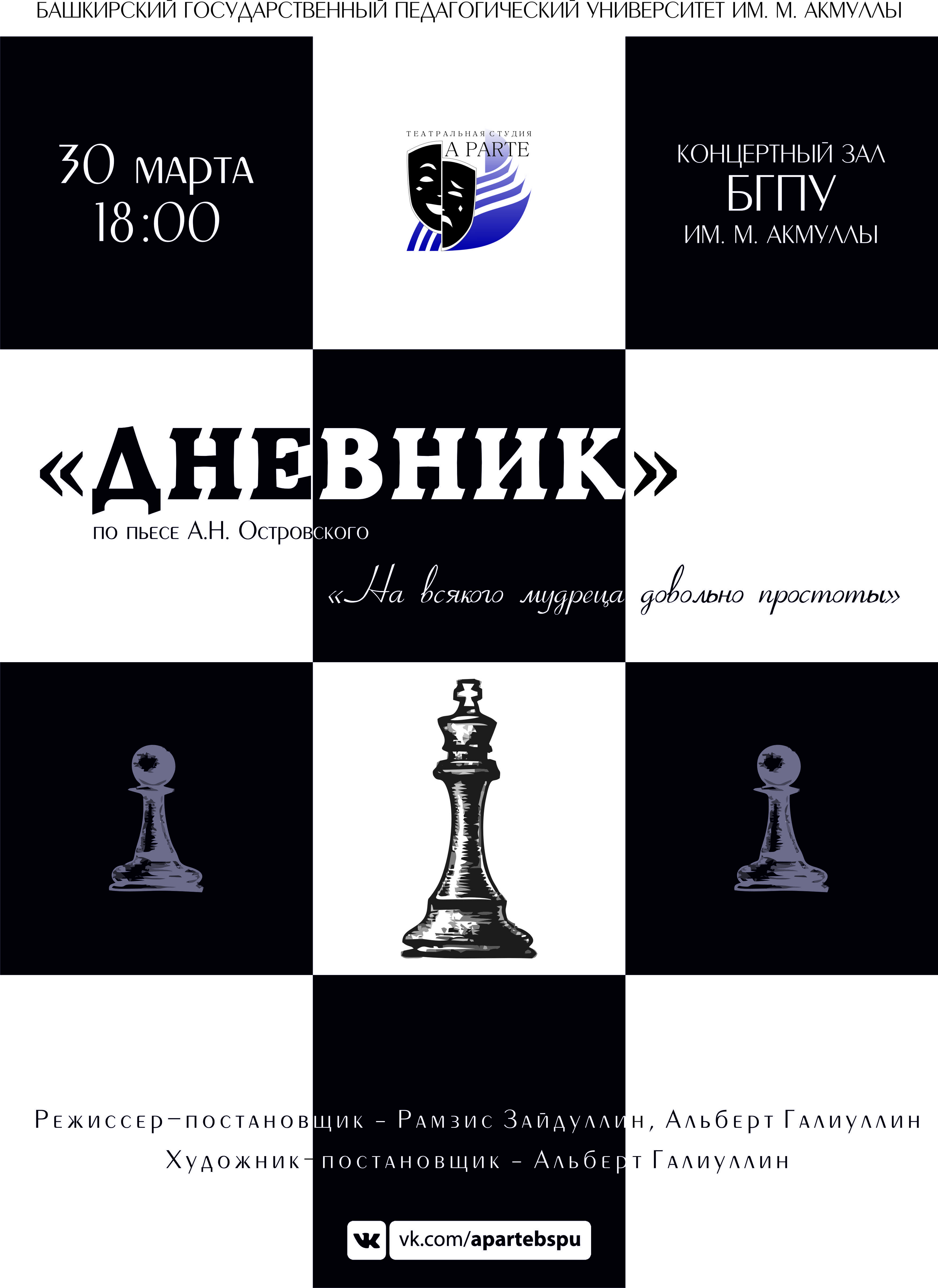 30 марта 2017 года в рамках фестиваля студенческого творчества «Студенческая весна – 2017» театральной студией «A parte» БГПУ им. М.Акмуллы будет представлен премьерный спектакль «Дневник» по пьесе Александра Николаевича Островского.