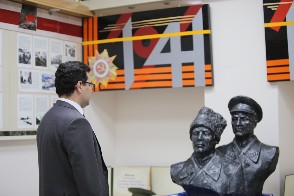 В честь Дня Победы ректор Акмуллинского университета Салават Сагитов возложил цветы к мемориальной доске и посетил музей, посвященный 214-й стрелковой дивизии.