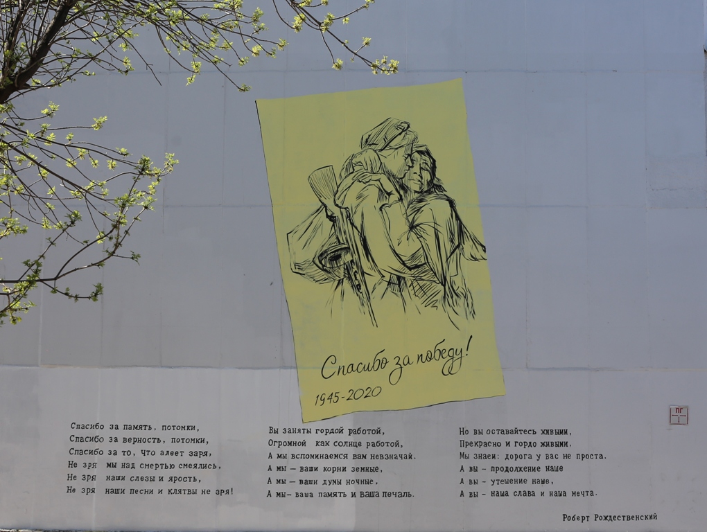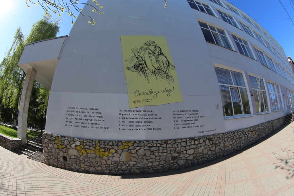 А на стене первого корпуса появилось граффити с изображением вернувшегося с войны солдата и стихами Роберта Рождественского. Автор творческого проекта – известный в Уфе художник Олег Кайбышев. Позже рисунок планируется дополнить фразой "Чтобы небо оставалось голубым, я должен быть..." и продолжениями для нее, которые смогут прислать все желающие. Наиболее яркие и интересные фразы будут написаны в верхней части стены, над открыткой. По замыслу автора, это своего рода обещание и ответ воинам-победителям от  современного поколения, для того чтобы не мельчать духом и быть достойными своих героических предков.