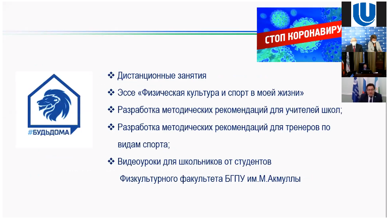 Салават Сагитов рассказал, в какой форме осуществляется спортивная жизнь студентов в условиях пандемии коронавируса COVID-19. Поделился итогами и результатами проекта «Здоровое поколение – сильный регион». Также озвучил задачи образовательного проекта «Спортивные кадры Башкортостана», разработанного в БГПУ.