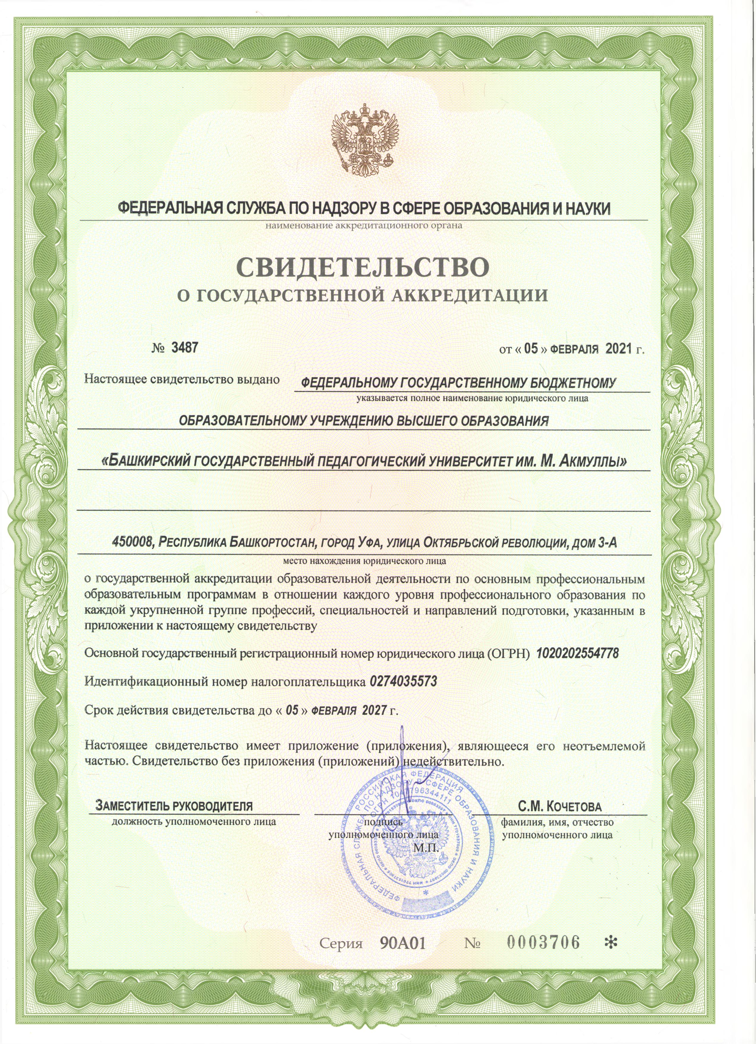 По результатам проведенных аккредитационных экспертиз на основании приказа Рособрнадзора № 101 от 5.02.2021 года Федеральное государственное бюджетное образовательное учреждение высшего образования «Башкирский государственный педагогический университет им. М. Акмуллы» признано прошедшим государственную аккредитацию образовательной деятельности сроком на 6 лет, до февраля 2027 года. Аккредитованы все 257 образовательных программ по 32 направлениям подготовки.