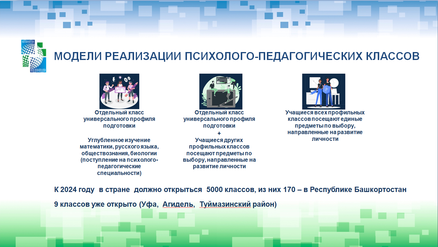 Педагогический технопарк станет одной из площадок для работы профильных классов психолого-педагогической направленности. Создание таких классов предполагает, что их учащимся будут даваться навыки т.н. «мягких компетенций», направленных на развитие личности учащегося и формирование востребованных компетенций и позитивного мировоззрения молодежи. Министерством просвещения ставится задача создания к 2024 году 5000 таких классов в стране, из них 170 должны появиться в Башкортостане. В апреле-мае 2021 года при поддержке Башгоспедуниверситета были созданы 9 пилотных классов в Уфе, Туймазинском районе и городе Агидель, результаты работы которых можно будет увидеть уже к концу этого года. БГПУ им.Акмуллы, БашГУ и Минобрнауки Башкортостана по имеющейся методике необходимо в ближайшие 2-3 месяца составить «дорожную карту» по реализации этого проекта в 2022-2024 гг.