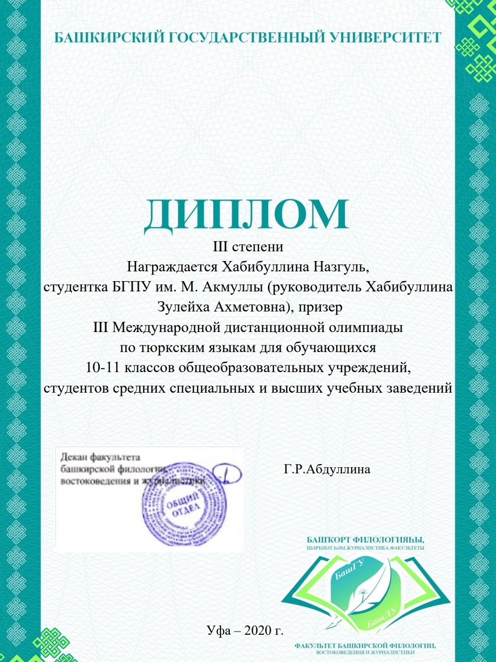 М. Аҡмулла исемендәге БДПУ-ның башҡорт филологияһы факультеты студенткаһы Наҙгөл Хәбибуллина төрки телдәр буйынса III Халыҡ-ара дистанцион олимпиадала призер булды.