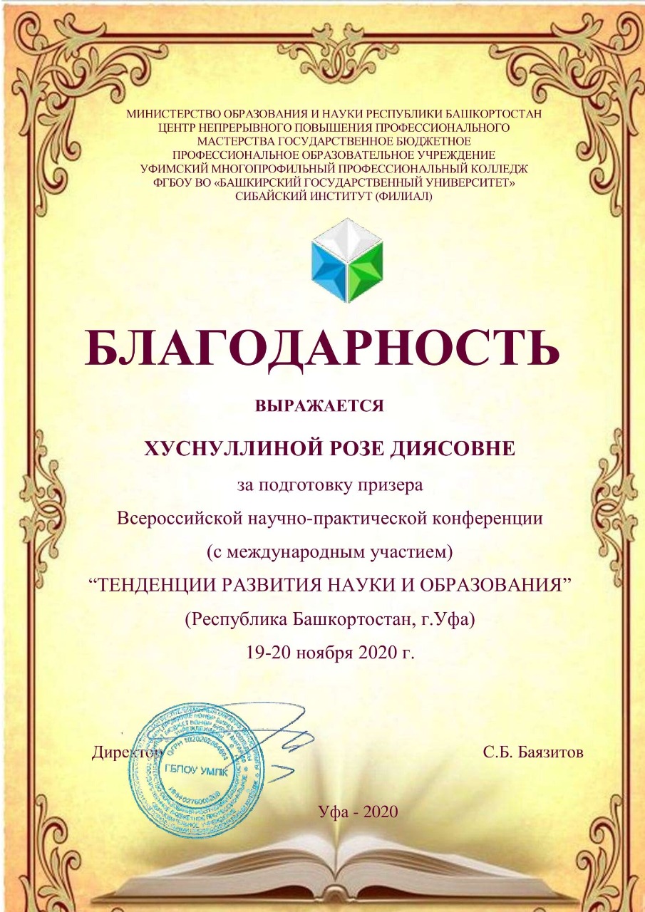 Студентка  4 курса факультета башкирской филологии Земфира Иргалина получила Диплом  2 степени  на конкурсе научно-исследовательских работ среди студентов и магистрантов, проведенном в рамках Всероссийской НПК (с международным участием) «Тенденция развития науки и образования». Мероприятие было организовано Министерством образования и науки РБ, Центром непрерывного повышения профессионального мастерства педагогических работников, ГБПОУ УМПК, а также Сибайским институтом БашГУ.